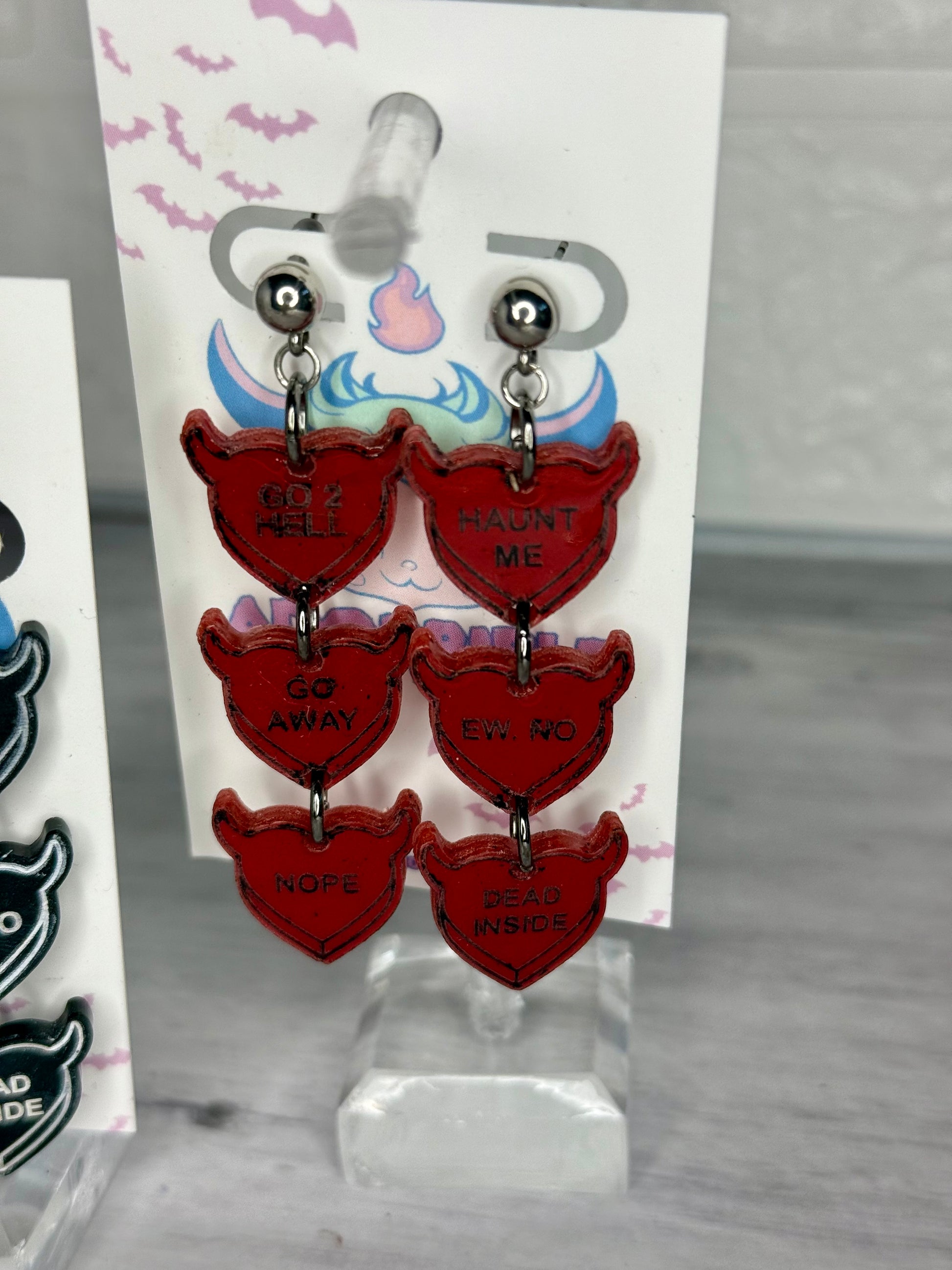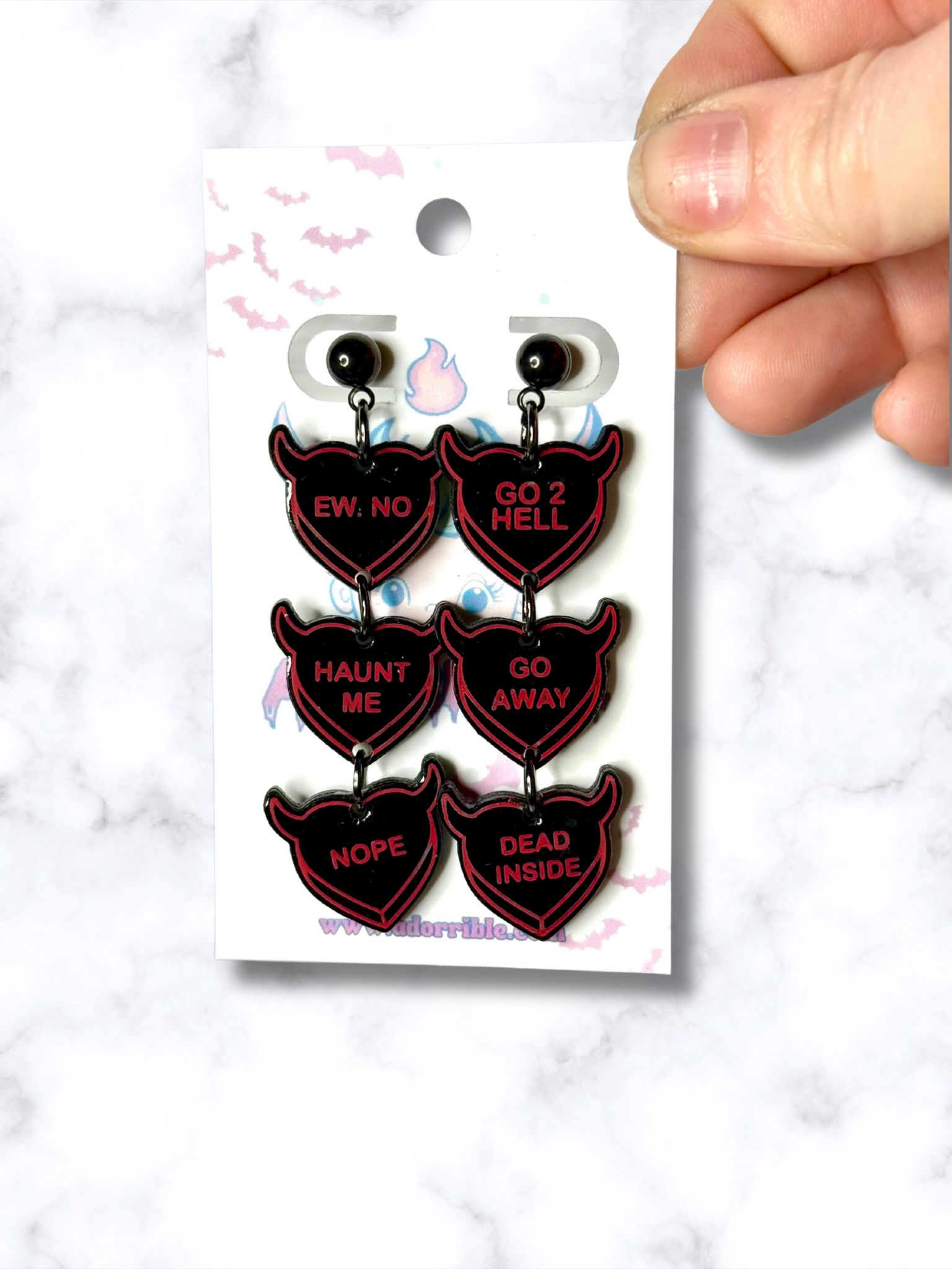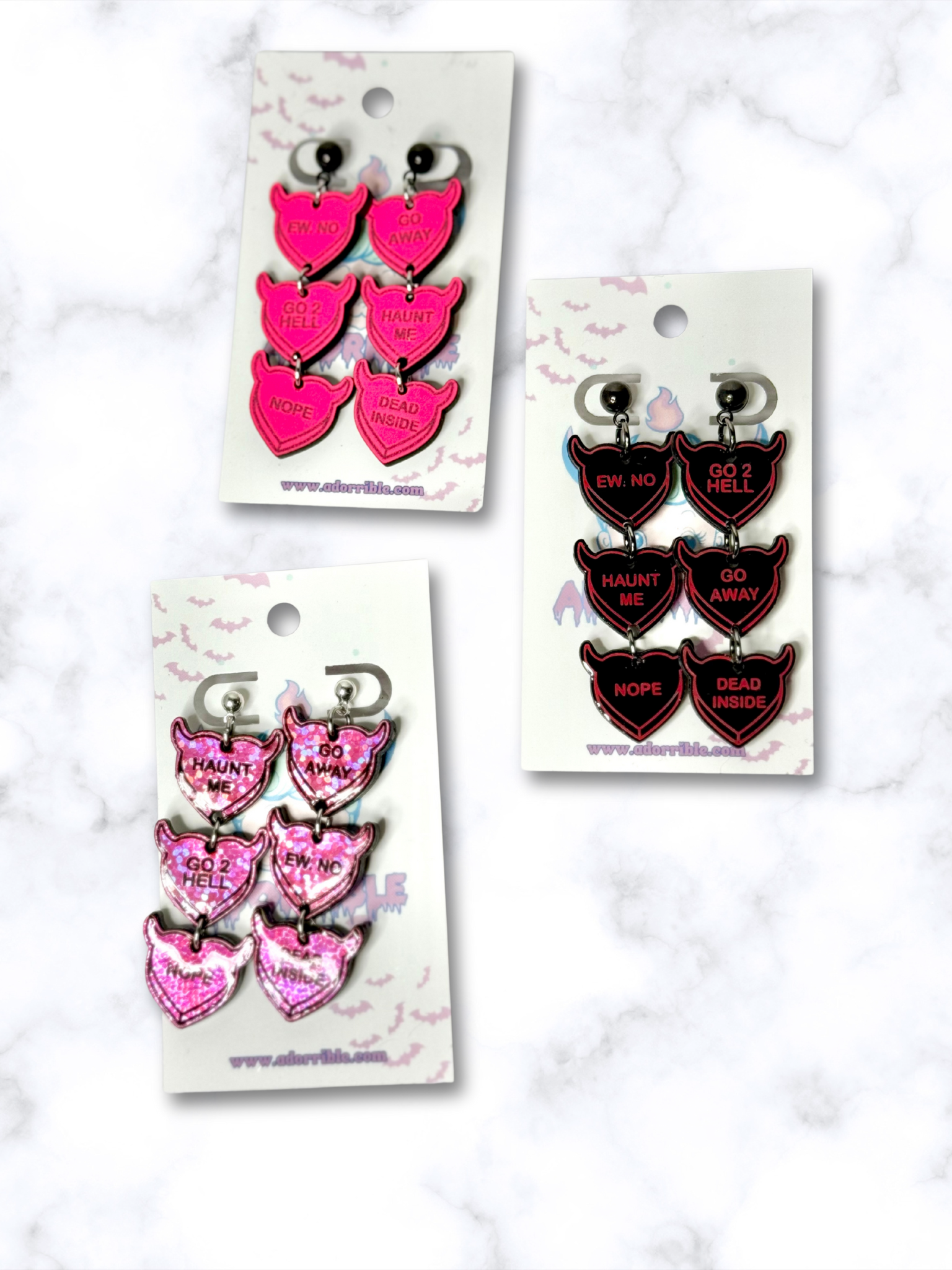Add a little devilish charm to any outfit with our Devilish Conversation Heart Earrings. These earrings feature cute devil horned conversation hearts strung together in a unique dangle design. Spread some love (or mischief) with these quirky and playful earrings!
