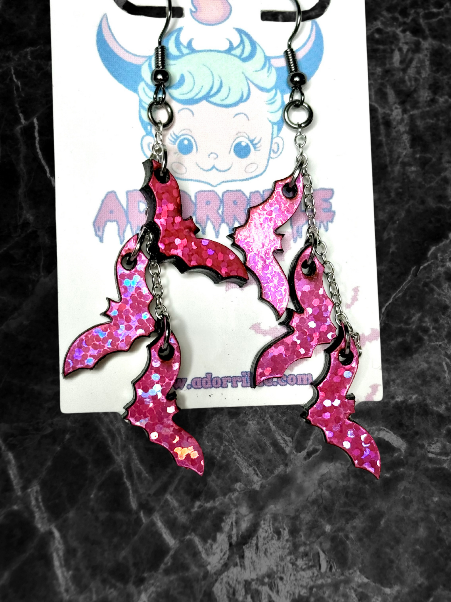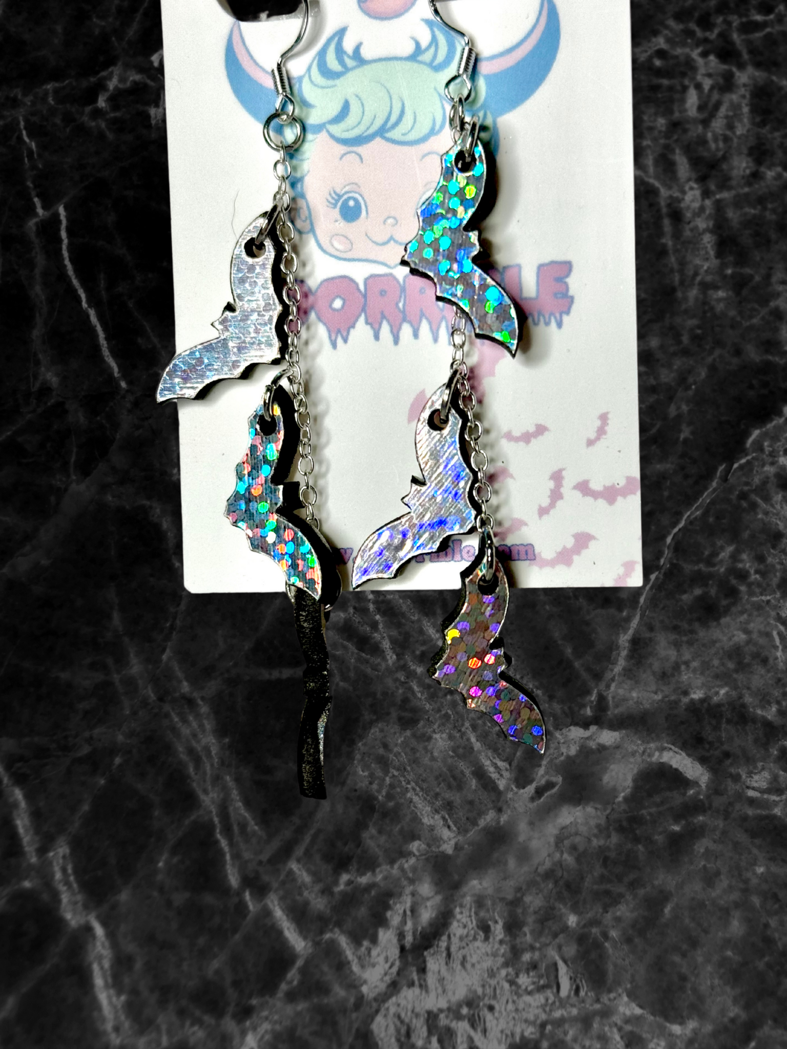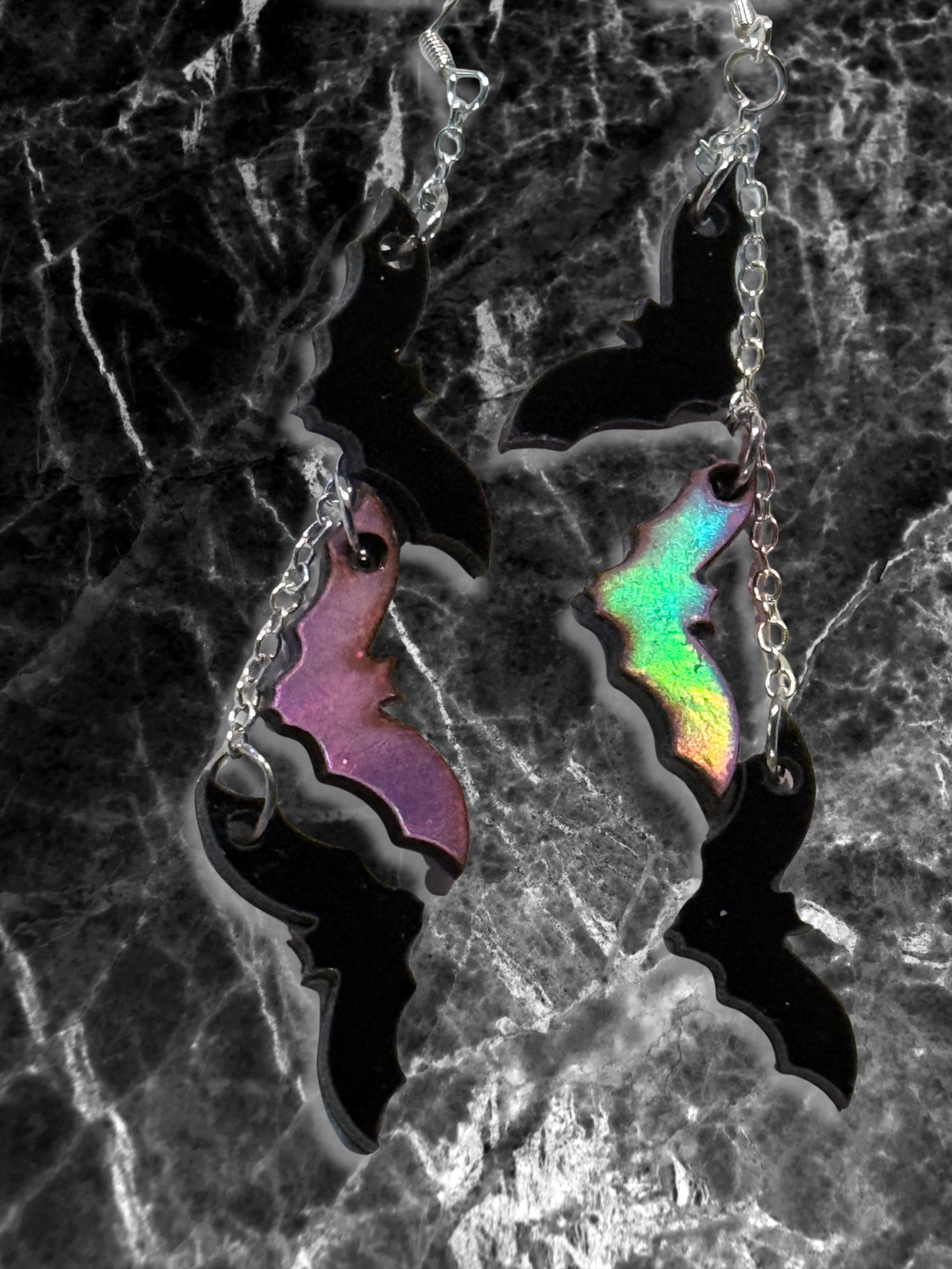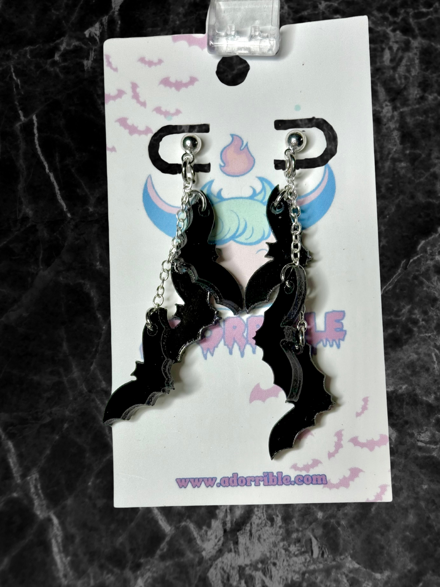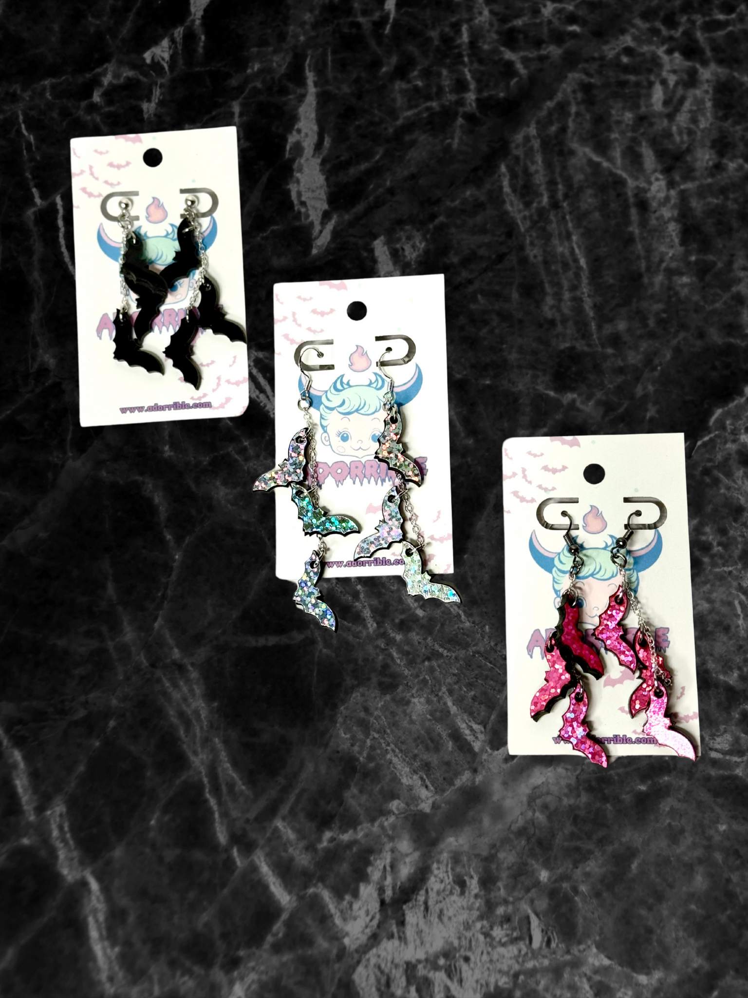 Get ready to take flight with these charming Flying Bat Dangle Earrings! Made with small acrylic bats on long dangle earrings, these earrings are perfect for adding a touch of spooky cuteness to any outfit. Give them as a gift to the bat-lover in your life or treat yourself to some fun and quirky accessories.