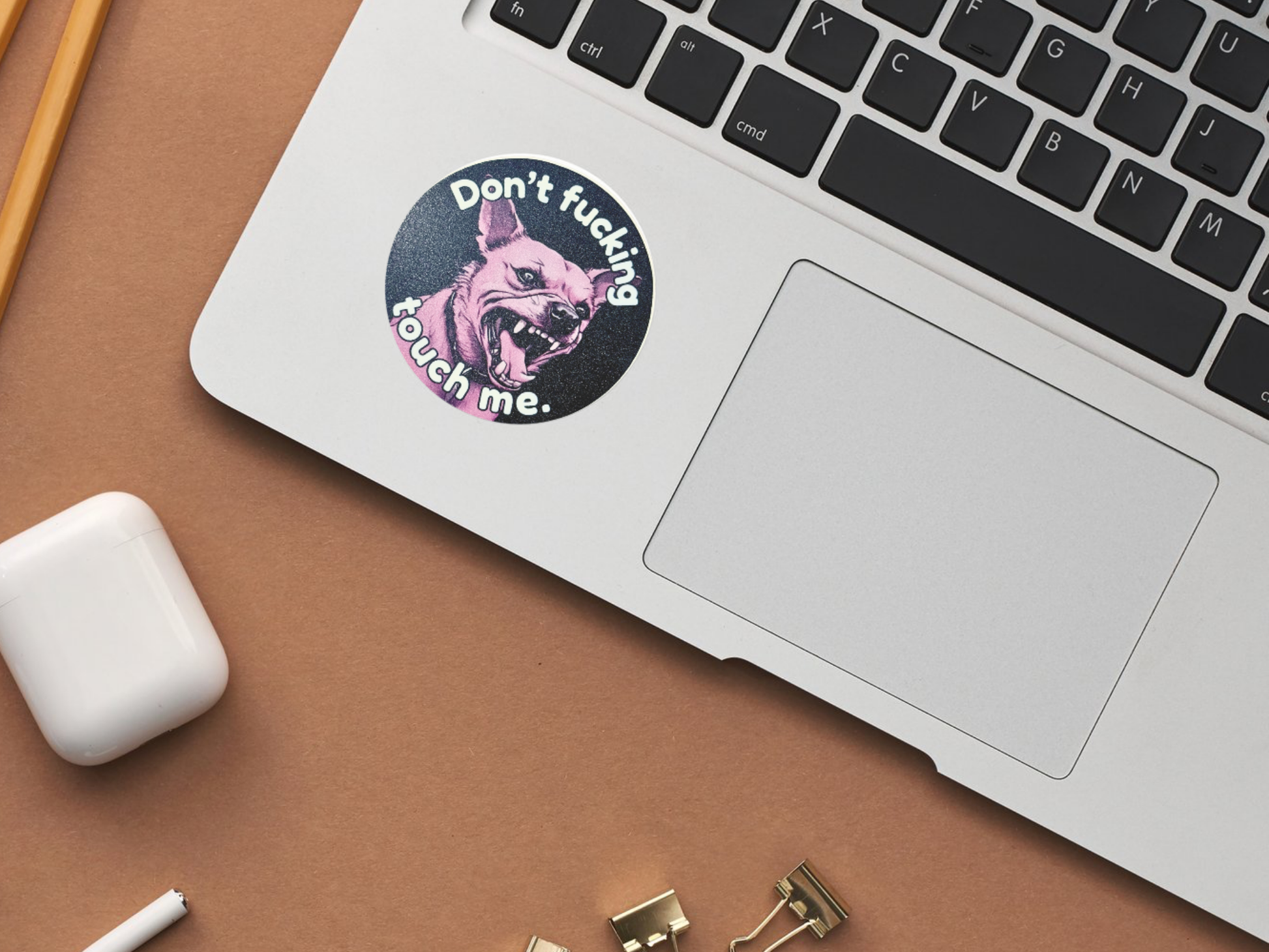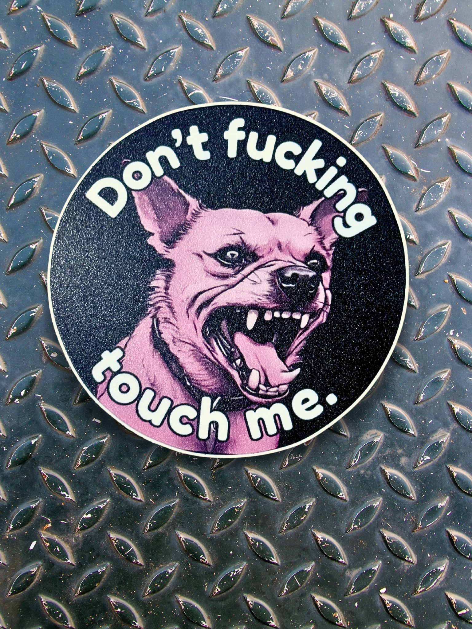 Guard your possessions with this Don't Touch Puppy sticker! Featuring a tough and no-nonsense pup design, this round sticker is not only durable but also has a matte finish. Perfect as a gift or a playful warning to keep those pesky roommates at bay.