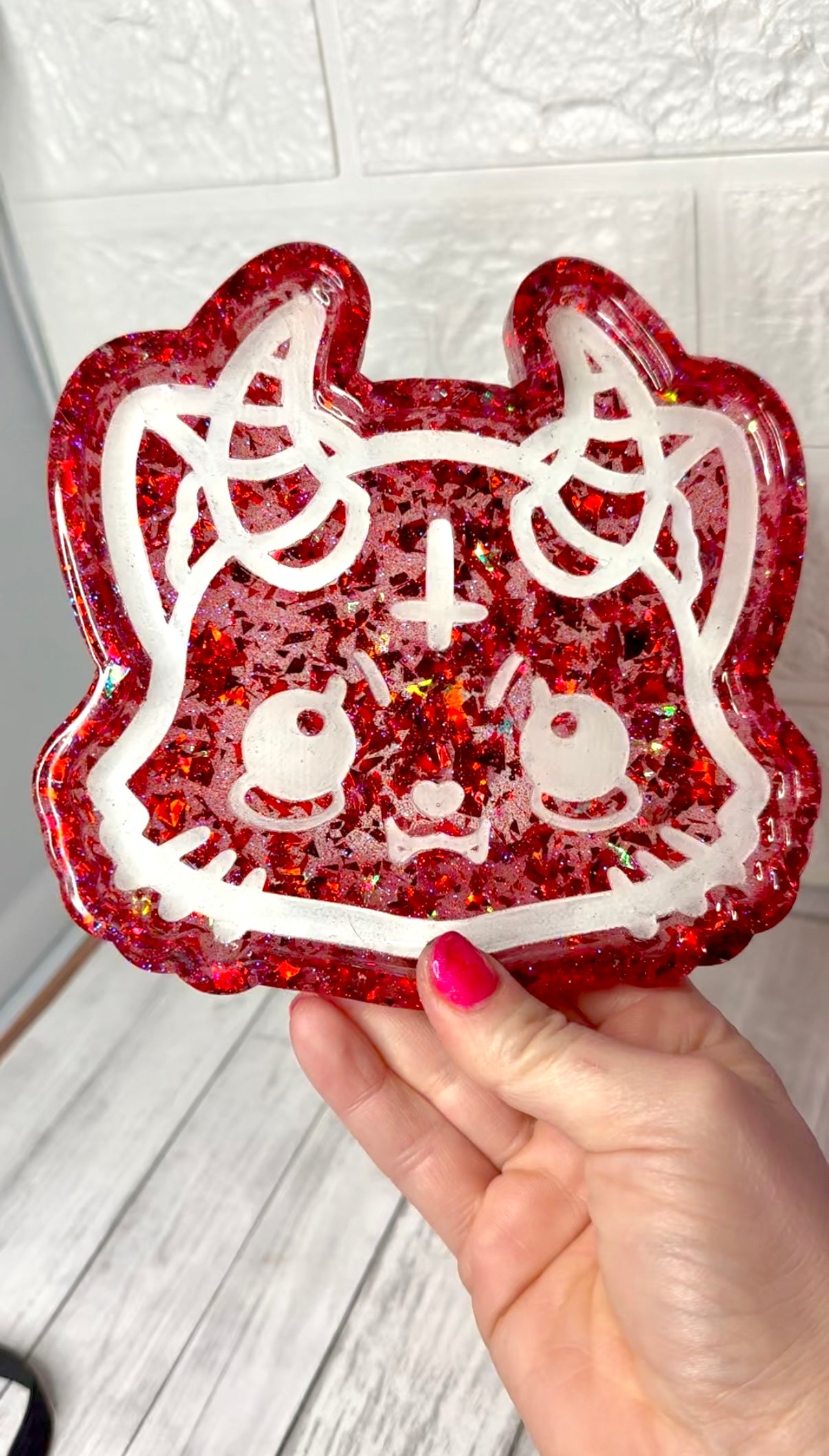 Anything but conventional, this one of a kind resin tray is shaped like an adorable kawaii kitten head! The decorative yet useful tray is quite striking with a glitter base color with contrasting details. The perfect home accessory for a goth/spooky vibe. The tray is water resistant so you can use it for anything you can imagine! The tray is shallow and perfect to hold all sorts of small accessories from keys and extra pocket change to jewelry to make up and more! A perfectly creepy addition to any office, bath, kitchen or other room.