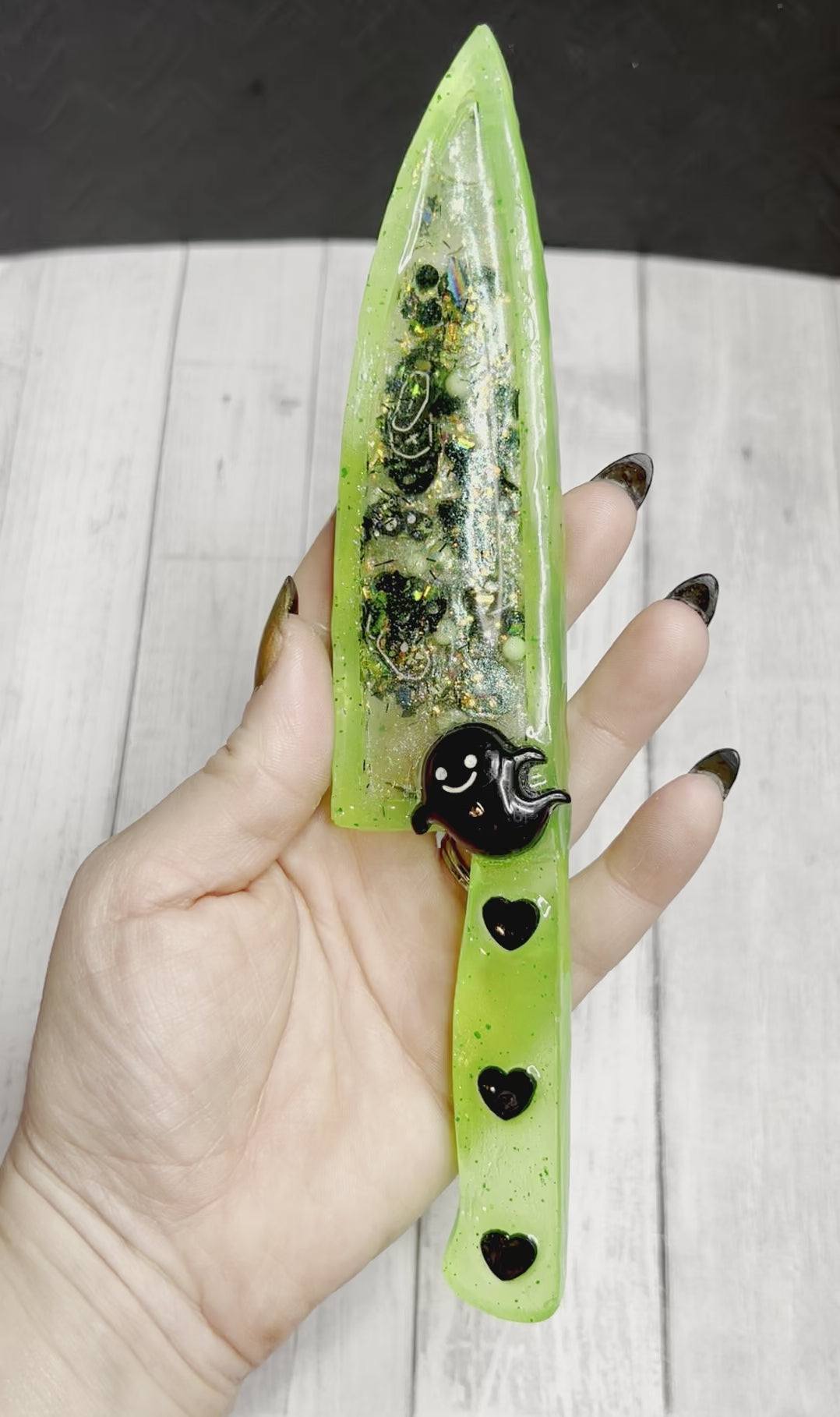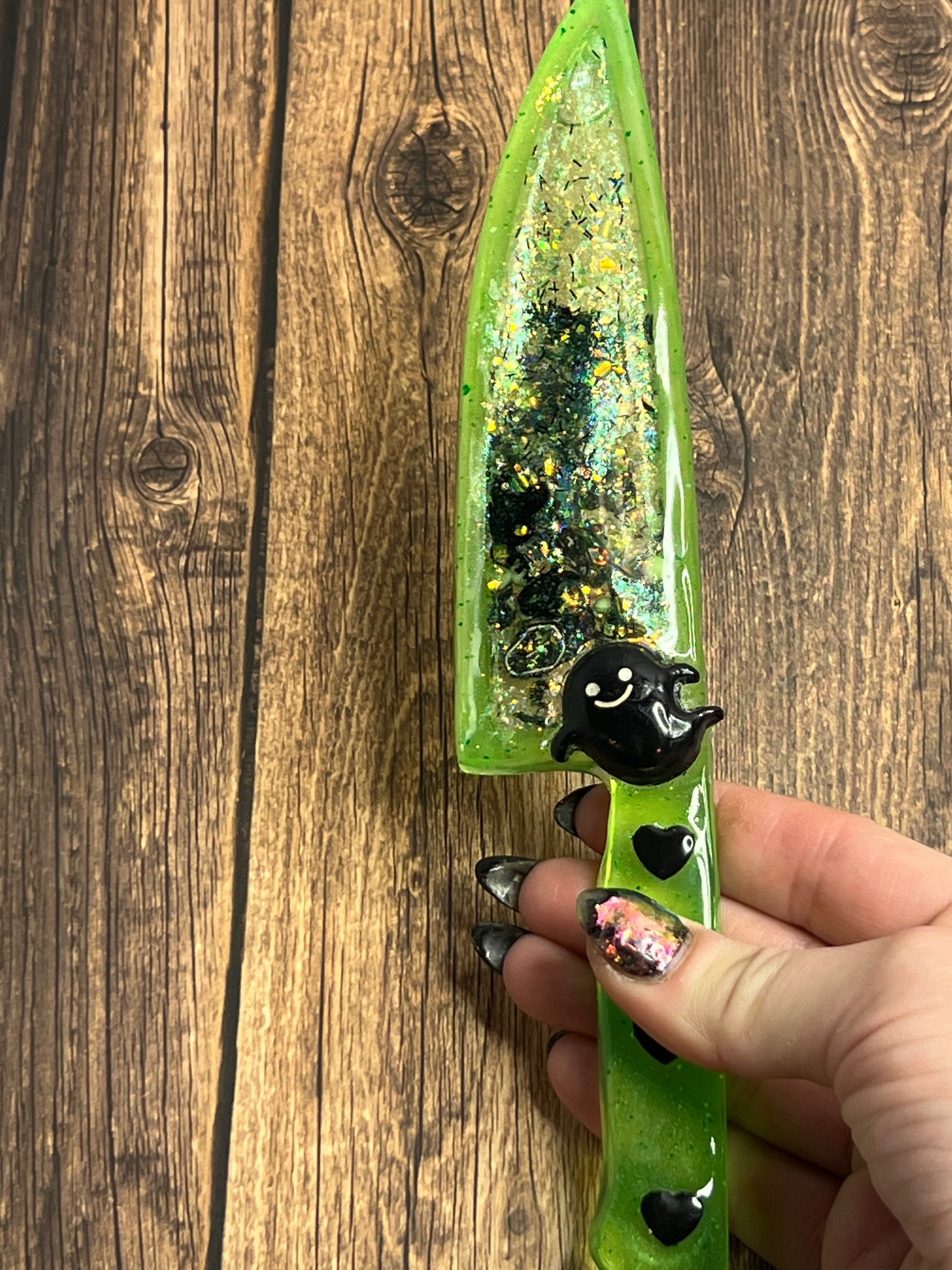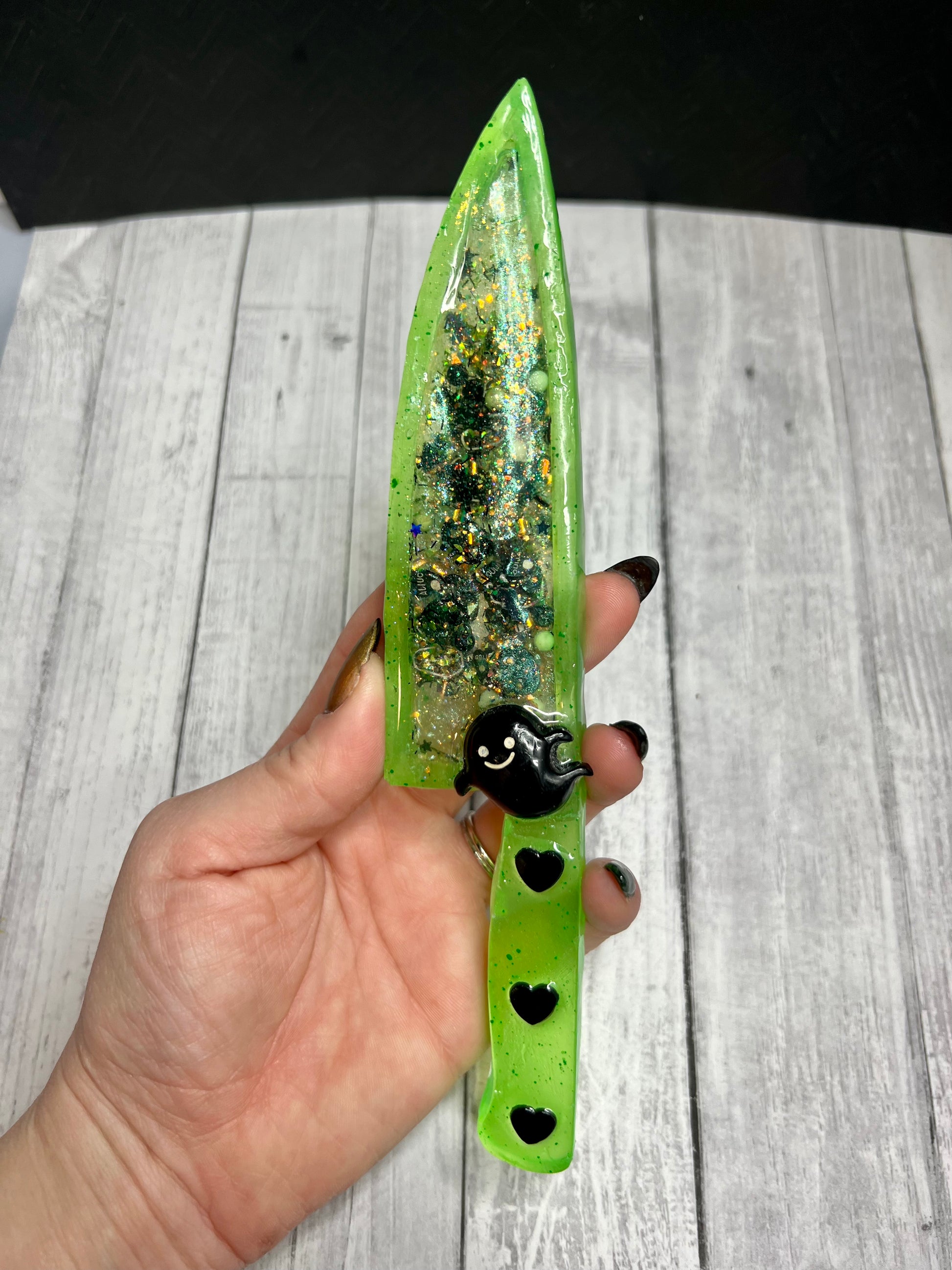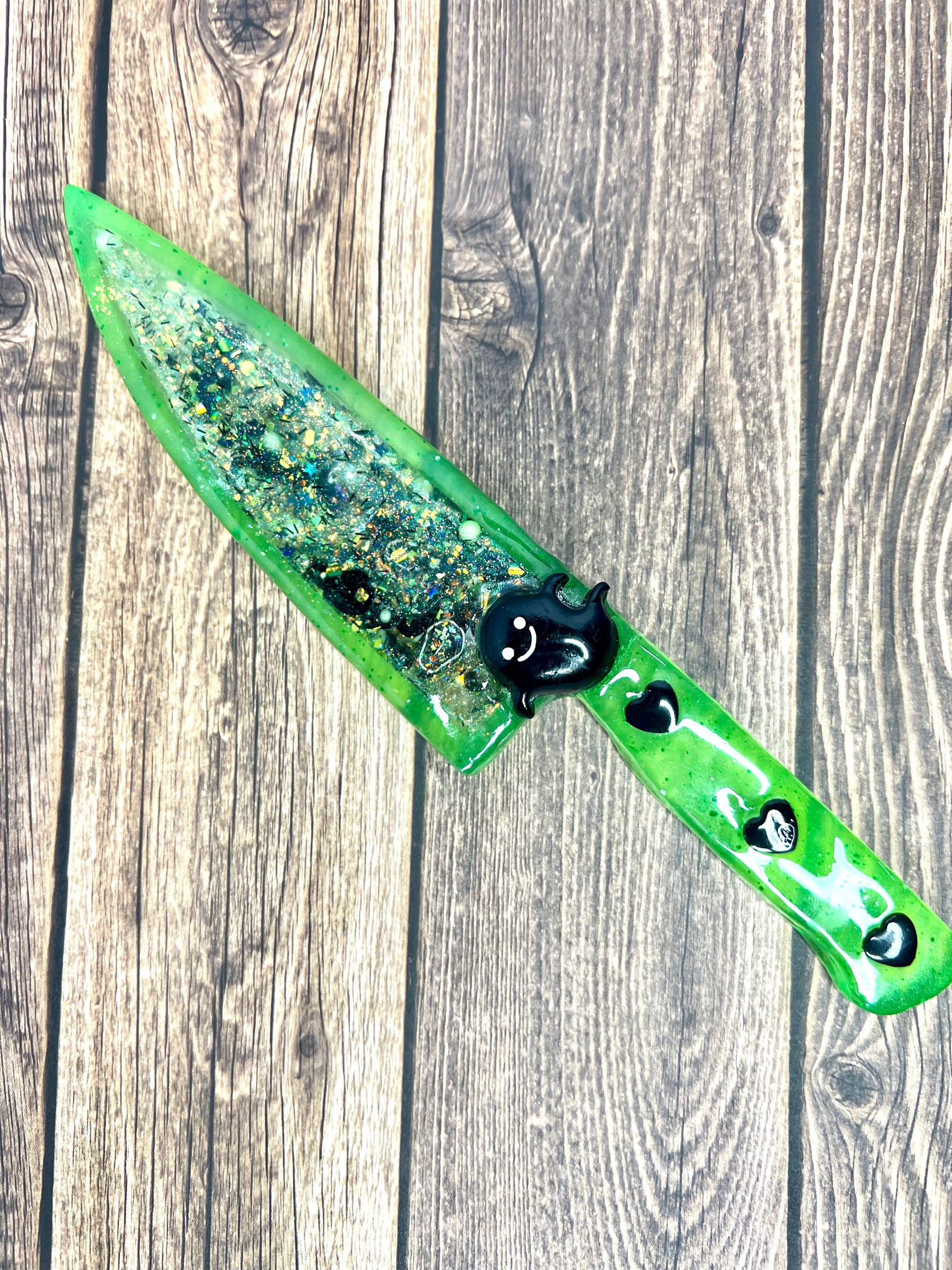 Spooky and sparkly! Could a girl want more? These large decorative knives are each filled with a variety of green, black and white spooky sprinkles, glitter, flakes and charms. The blade portion of knife is a hollow cavity is filled with liquid so the charms and glitter free float, like a badass snow globe! The handle is decorated with cute black ghost set in resin, so they will not shift or come loose. Please note, these are items are in no way sharp! They are works or art and are meant to be treated as such. Makes a cool gift for a friend or grab it for yourself!