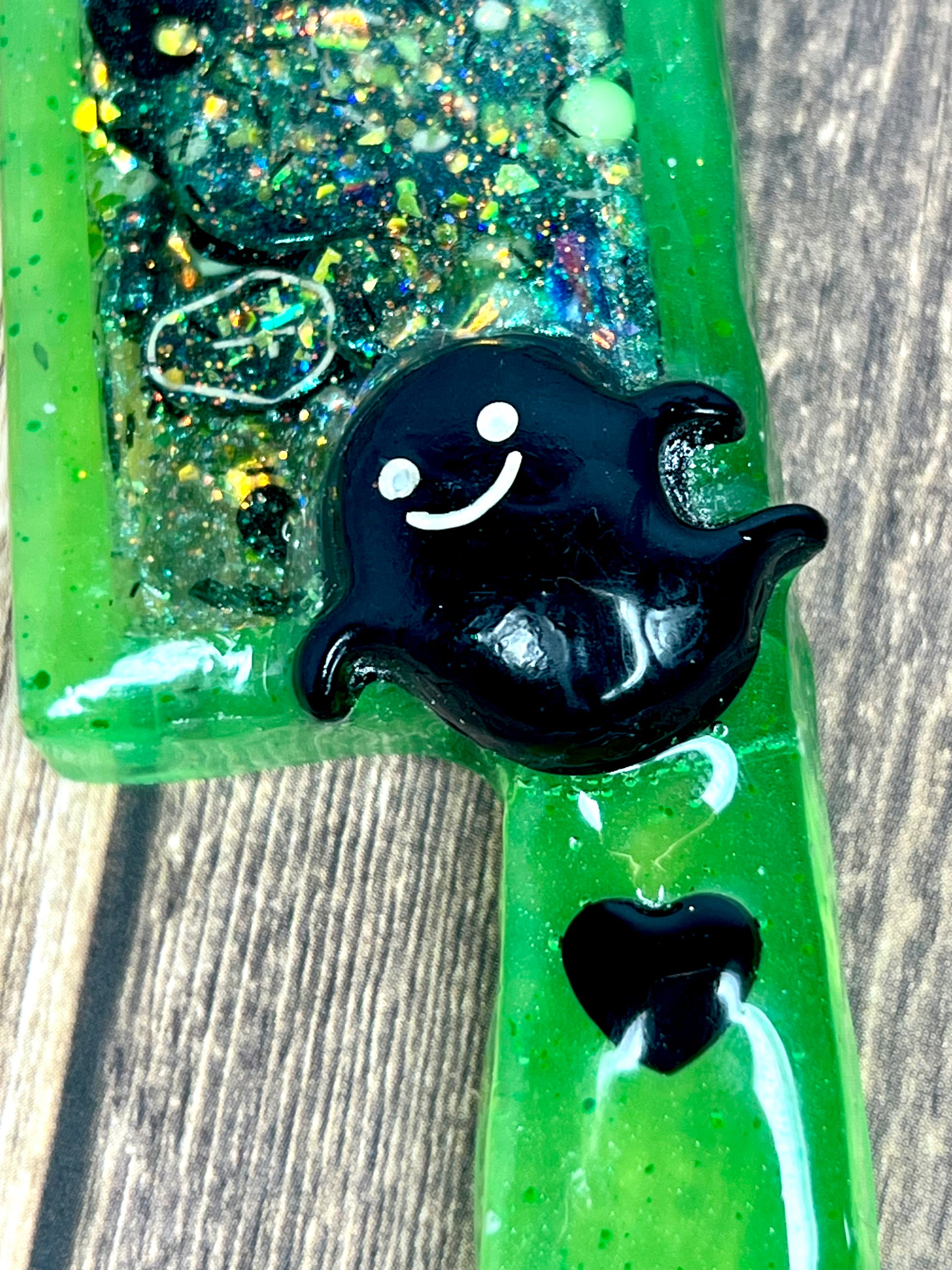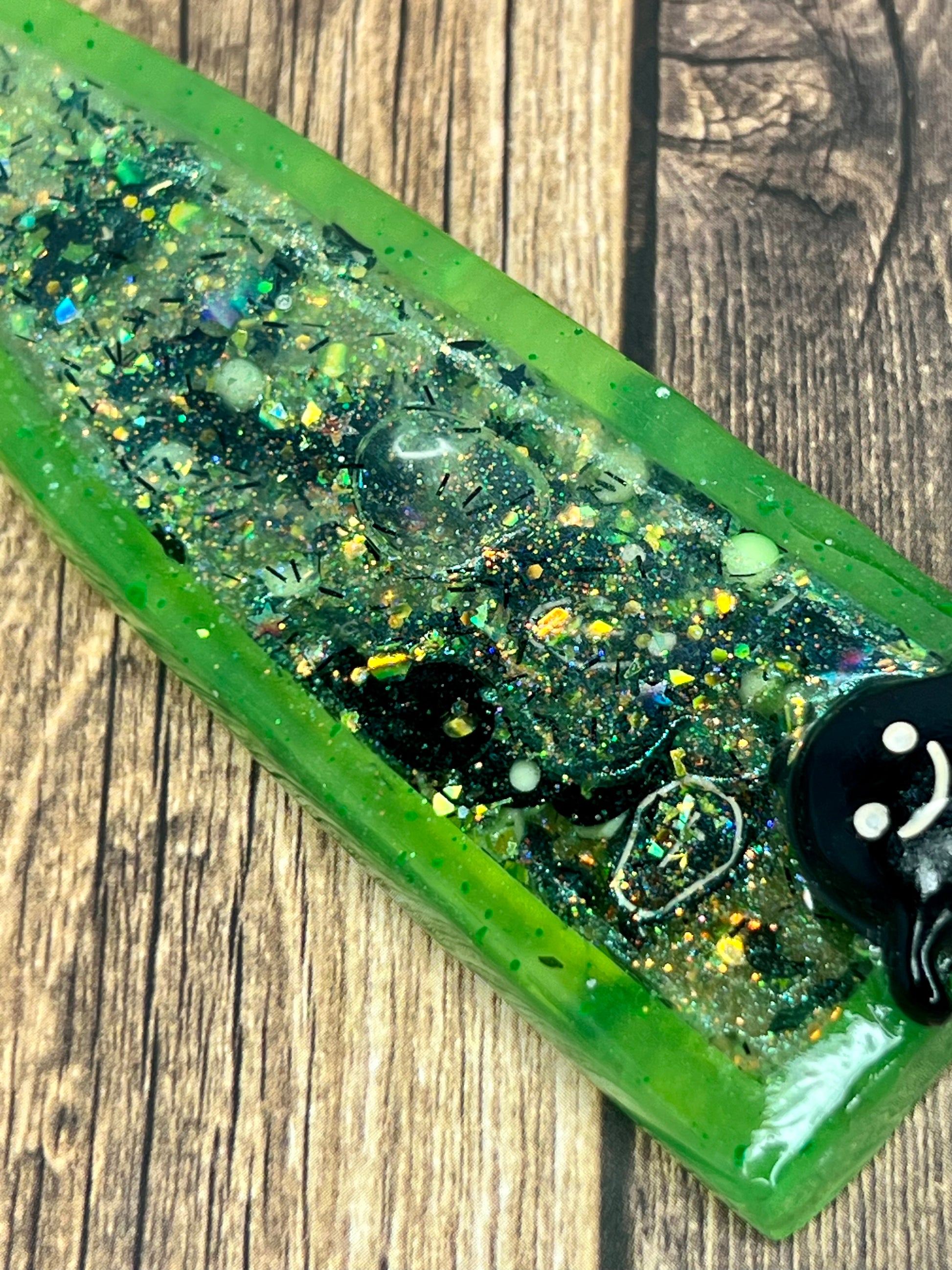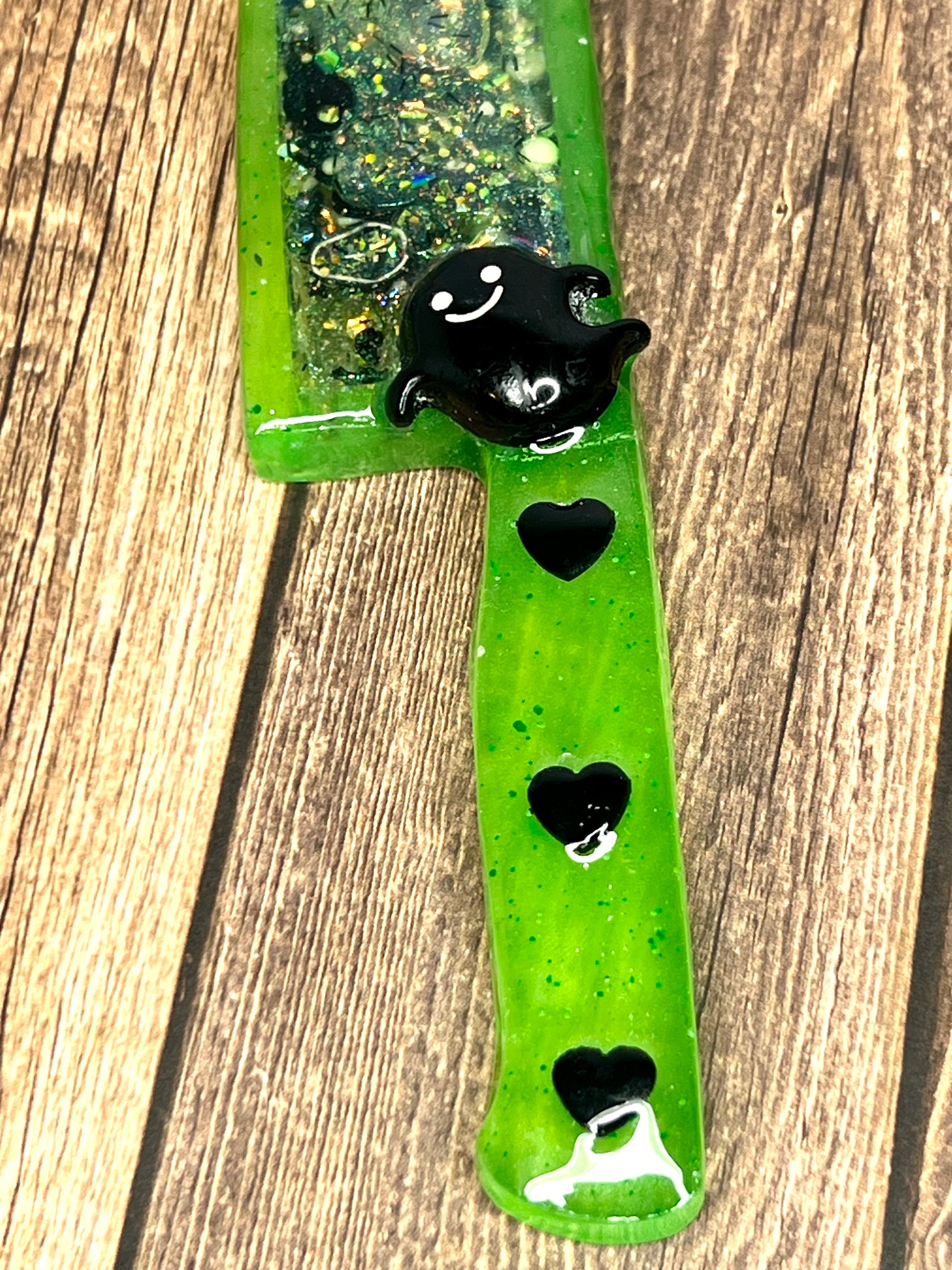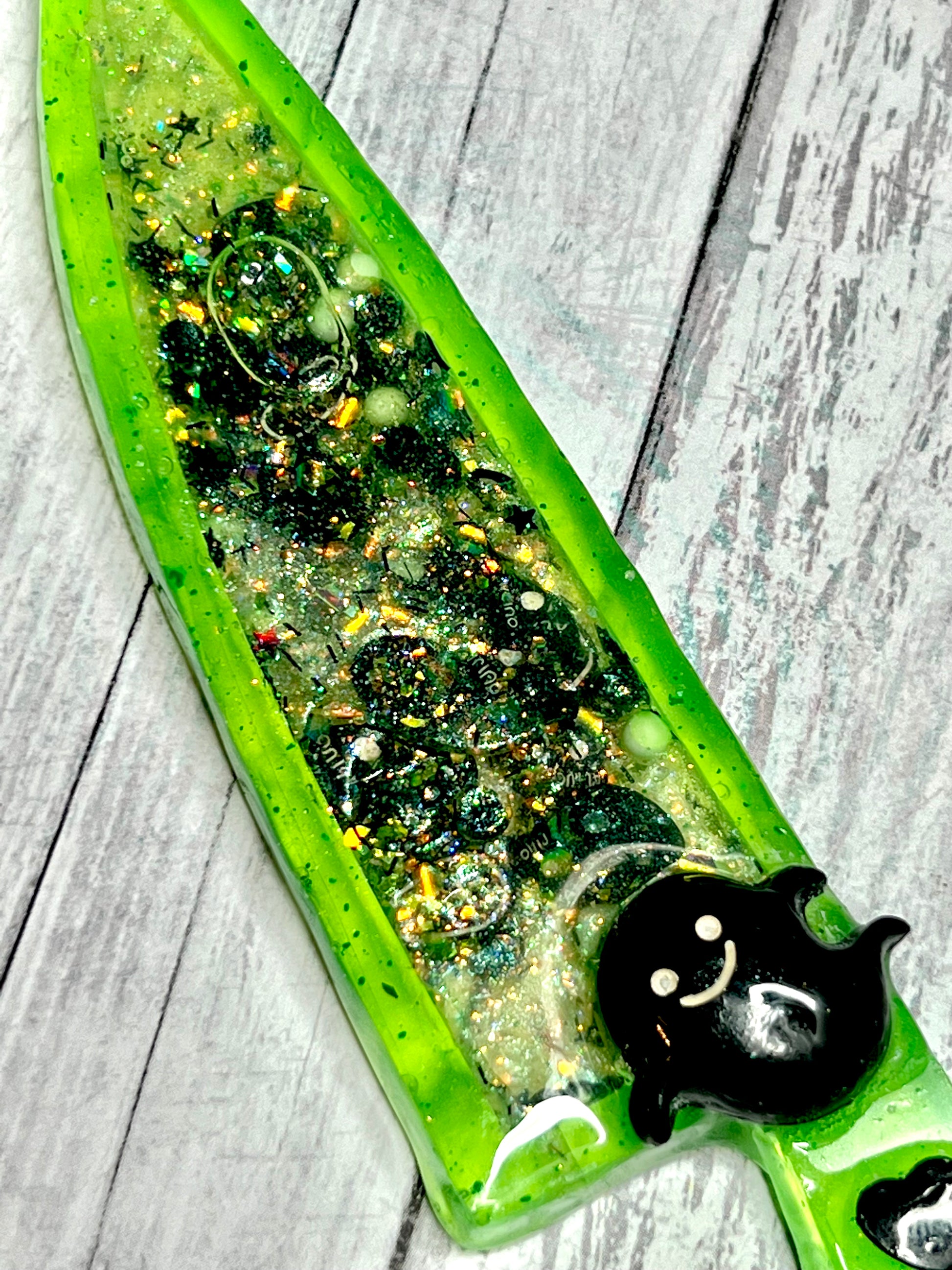 Spooky and sparkly! Could a girl want more? These large decorative knives are each filled with a variety of green, black and white spooky sprinkles, glitter, flakes and charms. The blade portion of knife is a hollow cavity is filled with liquid so the charms and glitter free float, like a badass snow globe! The handle is decorated with cute black ghost set in resin, so they will not shift or come loose. Please note, these are items are in no way sharp! They are works or art and are meant to be treated as such. Makes a cool gift for a friend or grab it for yourself!