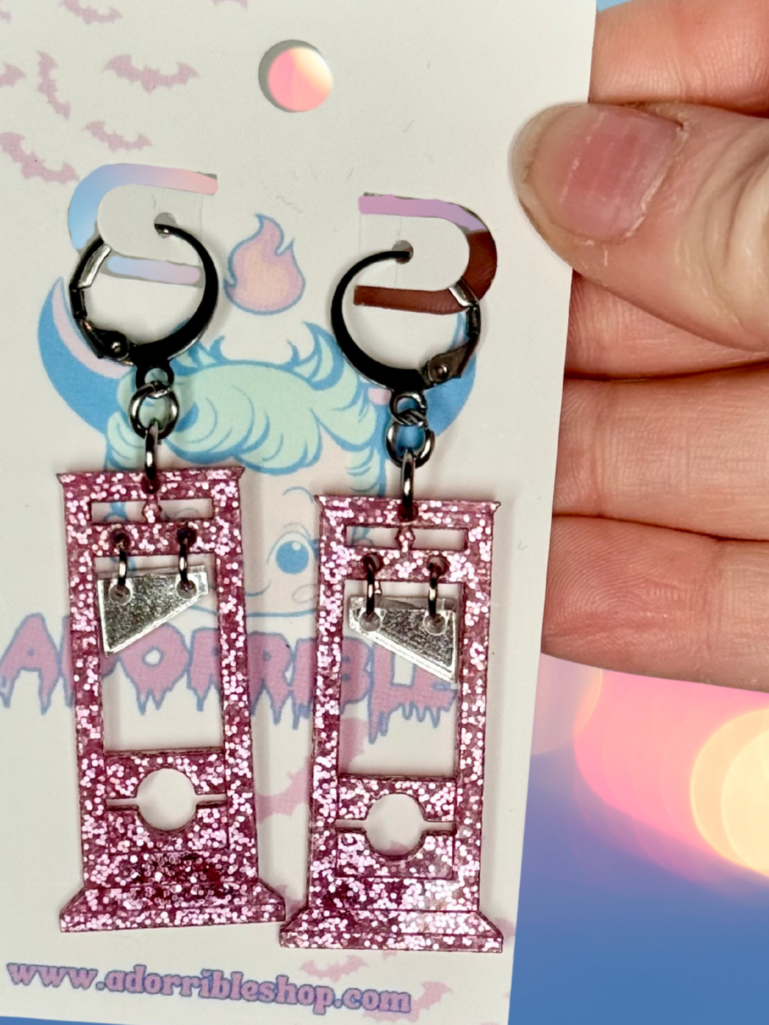 For the daring and bold, we offer Guillotine Earrings - a must-have accessory that combines fashion and horror. Our acrylic guillotines feature a dangling faux silver blade, available in both classic black and vibrant colors. Choose from lever back or stud styles to add a touch of daring to your outfit. Whether for yourself or a fellow horror or whimsigoth enthusiast, these earrings make the perfect gift!