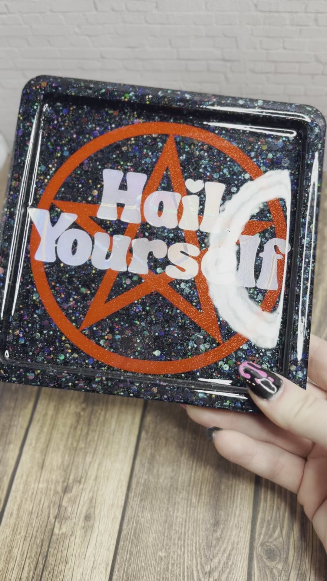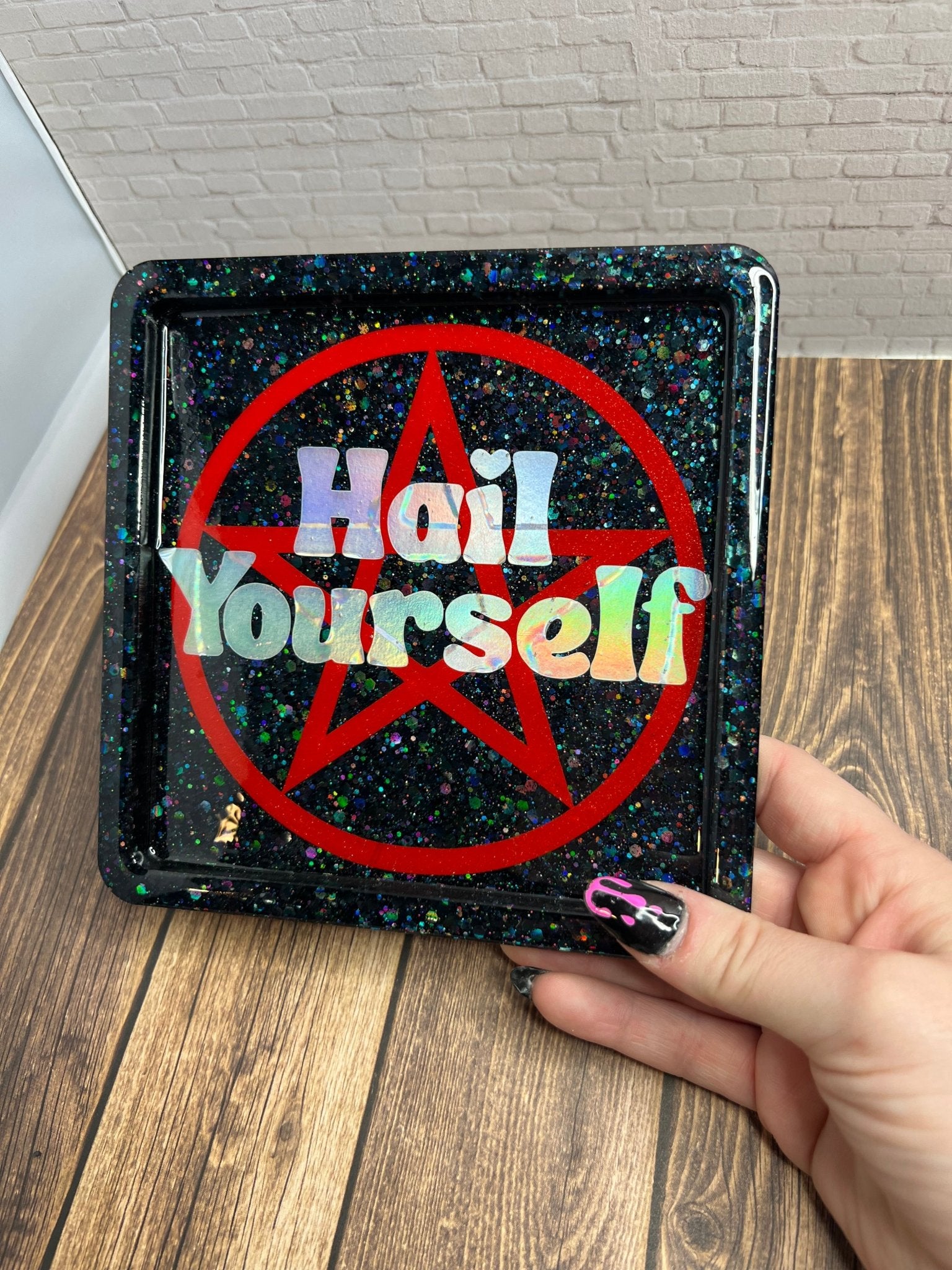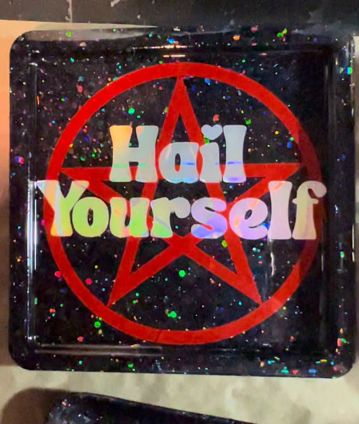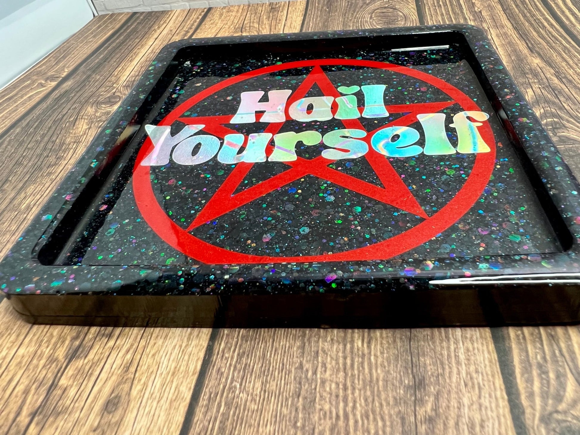 Need something that screams spicy beliefs but sweet? Well we have the thing for you. The tray is the perfect combination of sparkly and sassy. The tray is a pretty rainbow iridescent glitter with a black glitter pentagram and “hail yourself” in holographic pink. The material the tray is made of is water resistant and durable. Use it for just about anything you can think of! The square shape and shallow sides make it perfect to hold all sorts of small accessories from keys and extra pocket change to jewelry to make up and even office supplies! An sassy addition to any household or office!