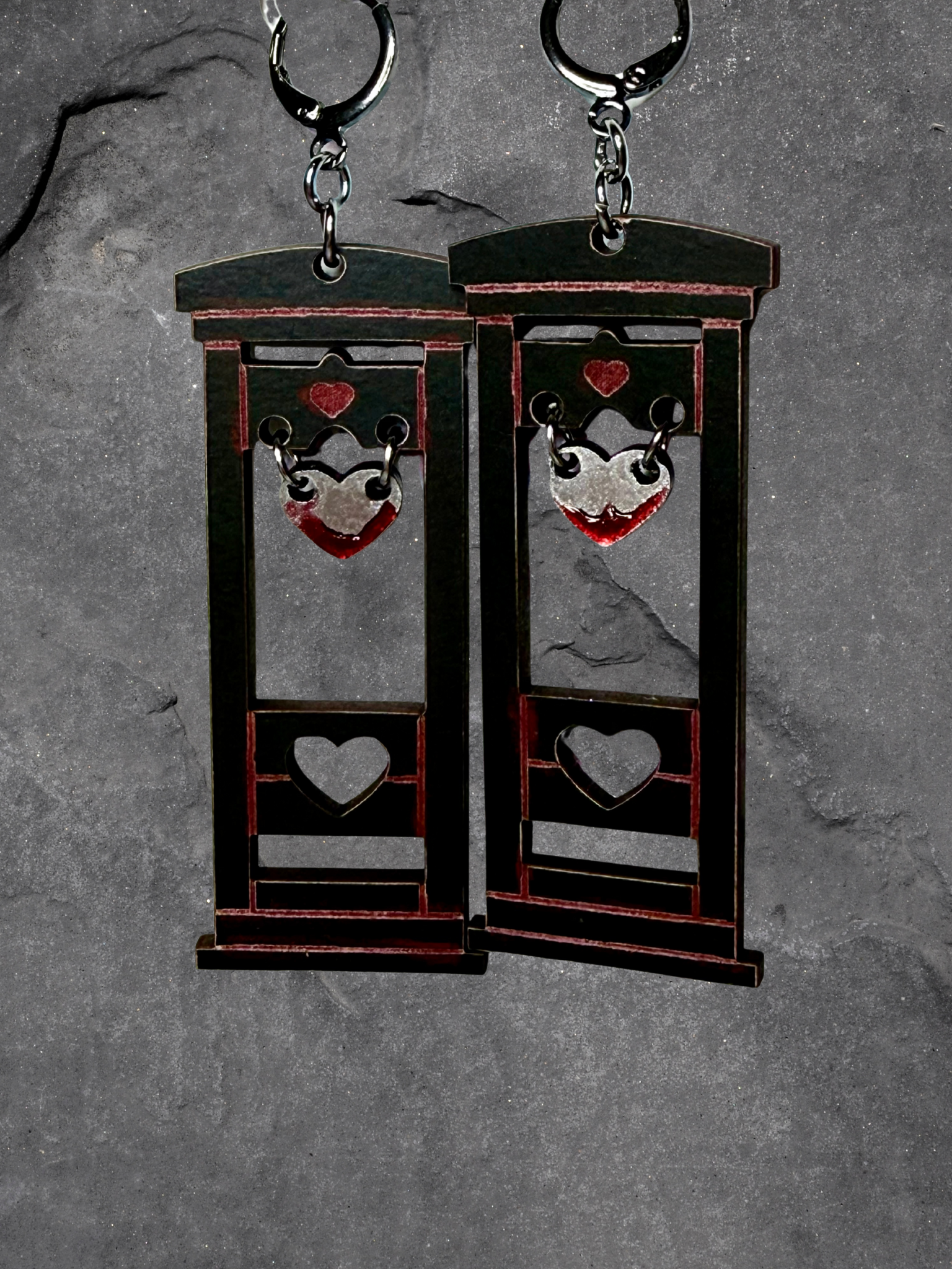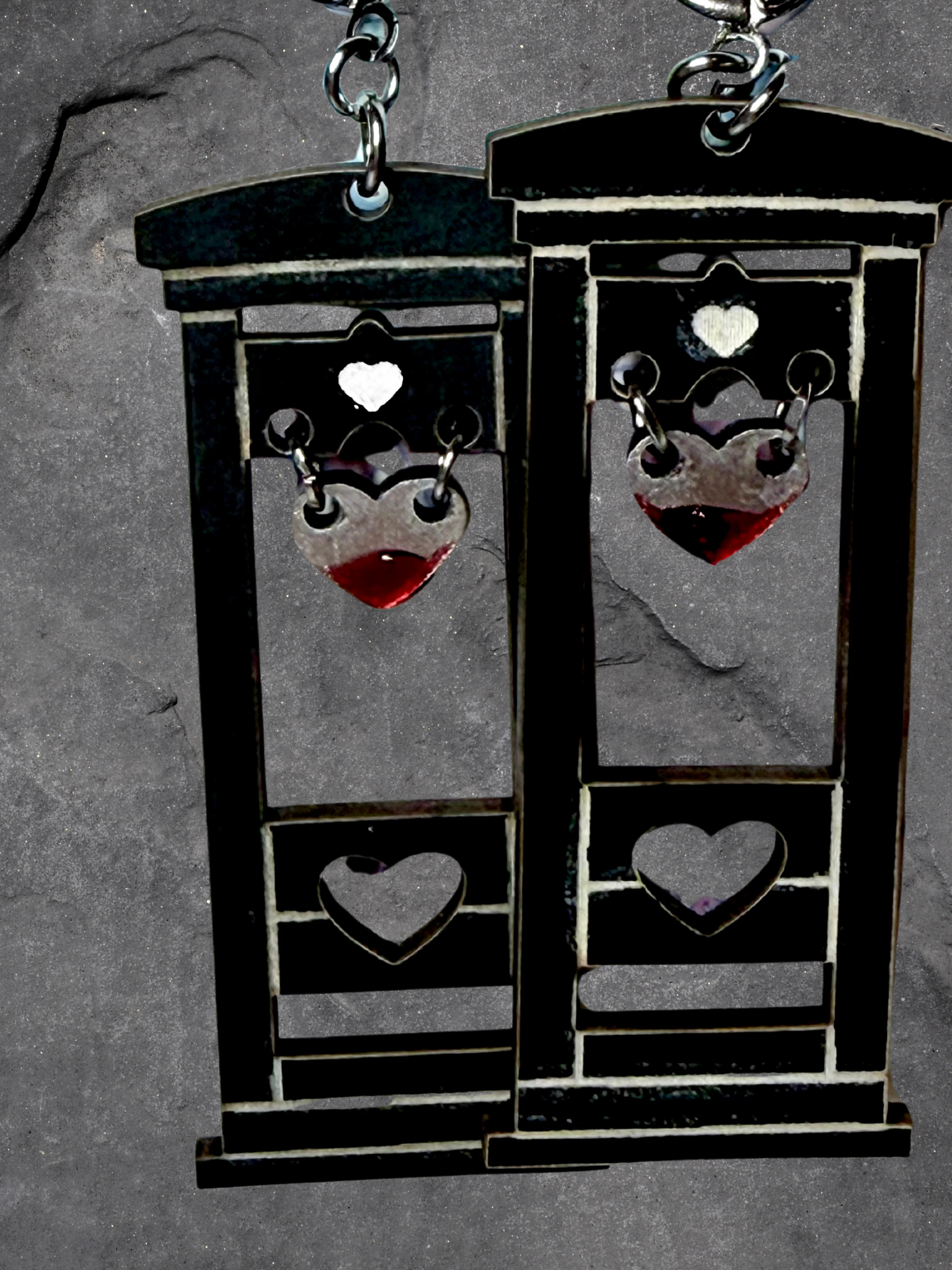 inject some macabre into your wardrobe with our Heart Guillotine Earrings! These lightweight acrylic or wood earrings feature a unique gothic design of cute heart-shaped guillotines. The lever back closures ensure secure wear without sacrificing comfort. A great gift for yourself or a fellow lover of all things quirky and unusual!