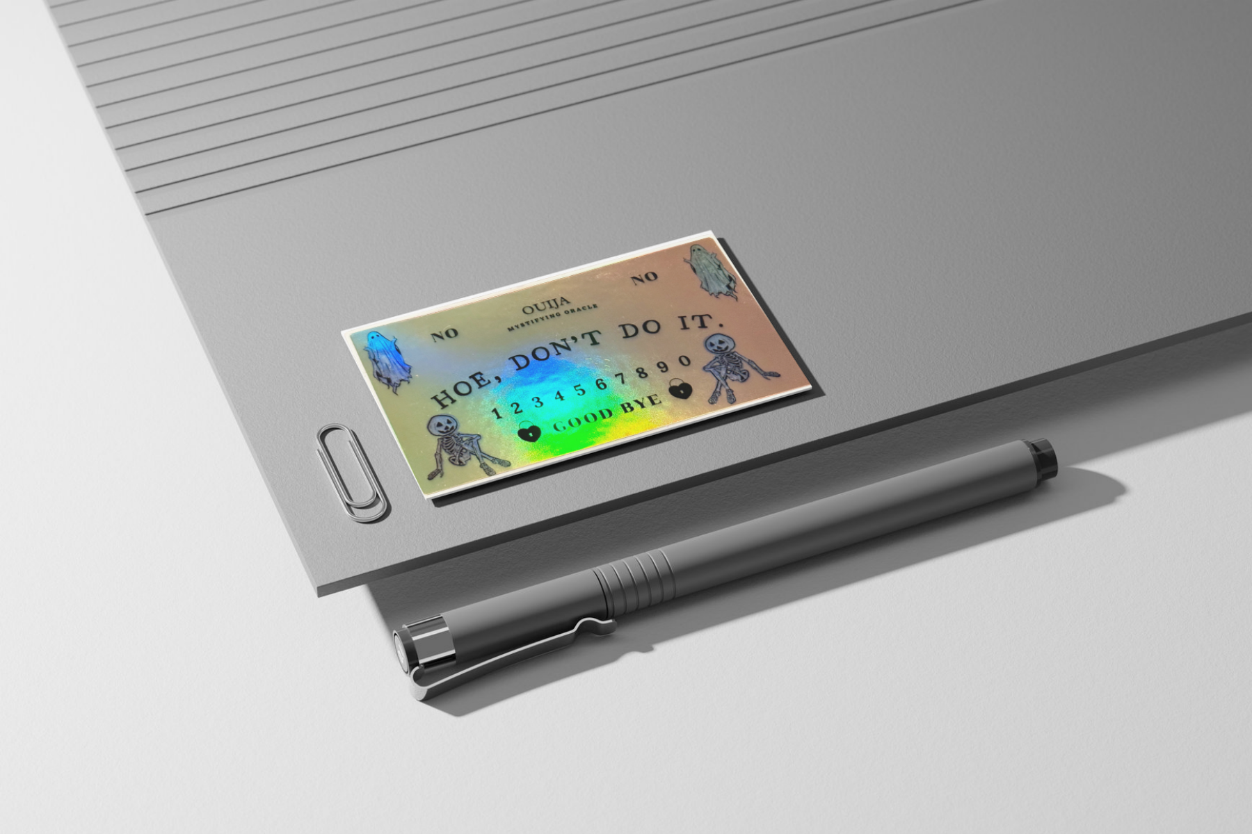 Take a risk with our Hoe Don't Do It Ouija Board sticker! Playfully spooky with a strong holographic finish, this high-quality and durable sticker features a custom design by our owner. Perfect for Halloween lovers, this cute Ouija board design combines fun and adventure in one bold sticker!