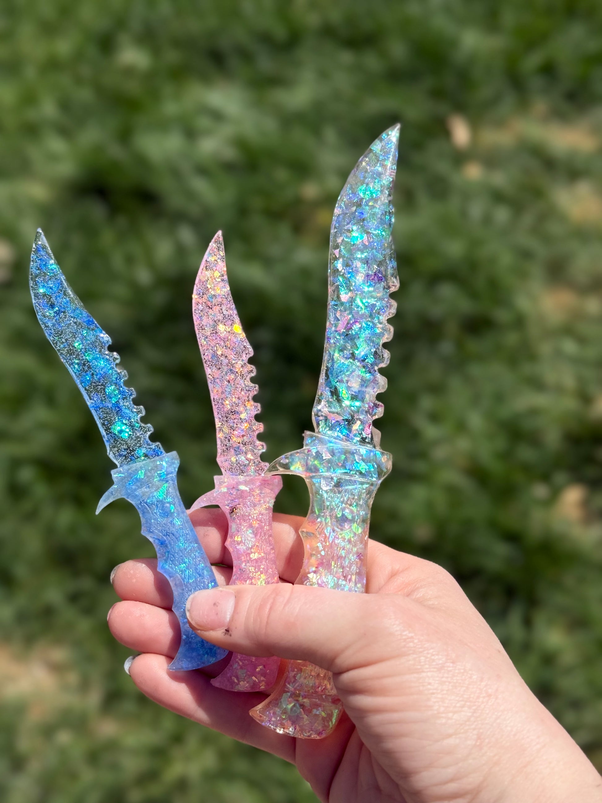For those who'd love to add some sparkle and attitude to their space, our one-of-a-kind Iridescent Flake Decorative Daggers are the perfect solution! Every piece is handcrafted with durable, waterproof resin, and adorned with a dazzling array of glittery hues.