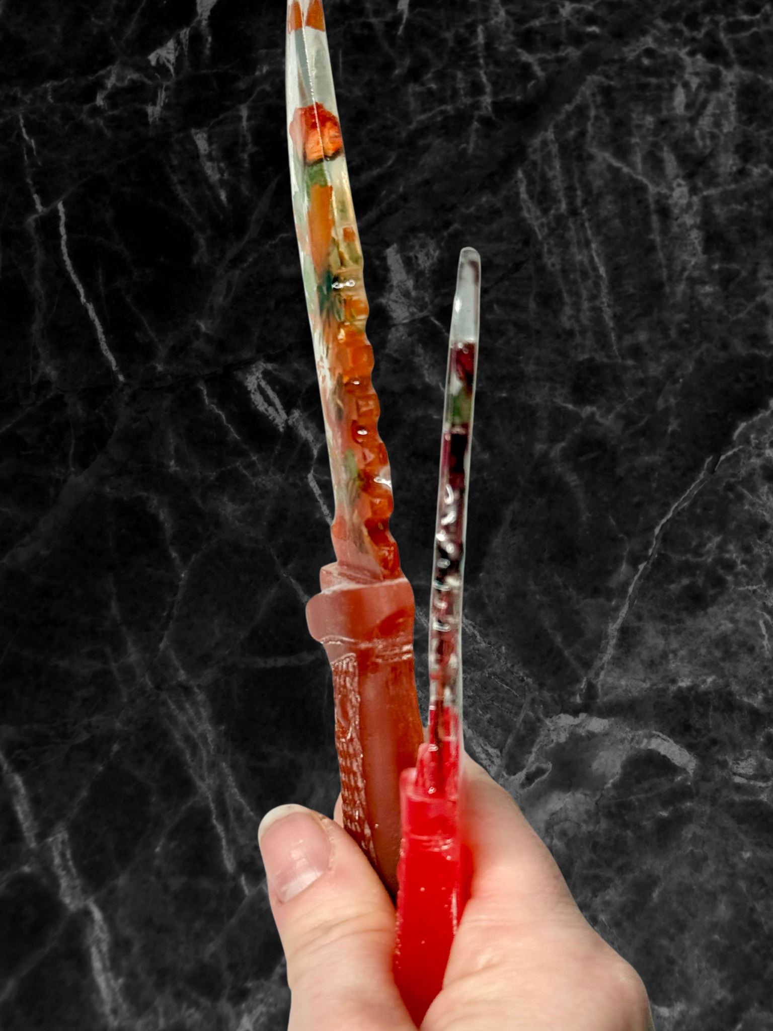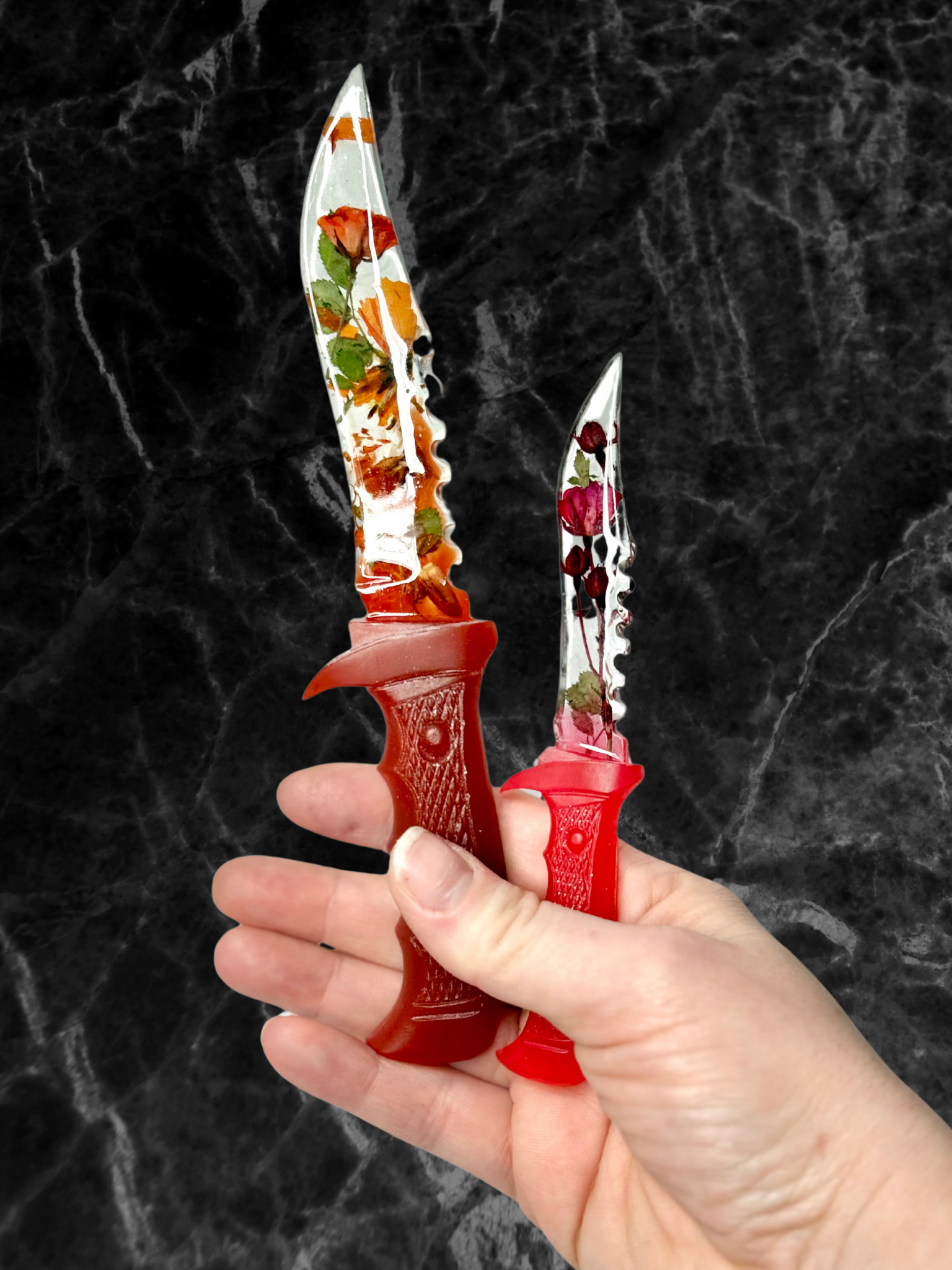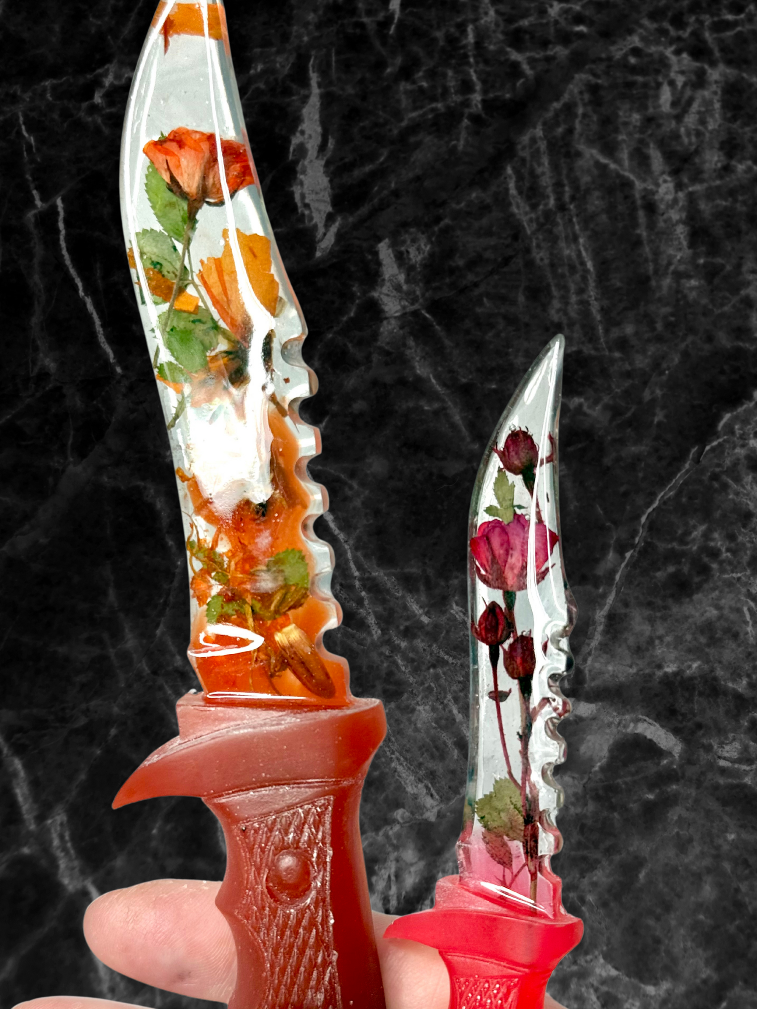 This dazzling dagger will make a statement! The fanciful resin decorative knife has a high shine clear blade containing different varieties of colorful flowers. The knife is paired with a contrasting matte handle.