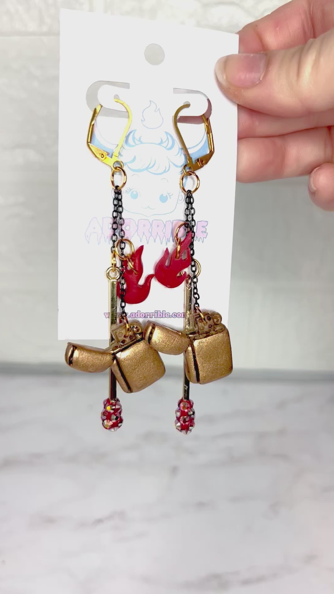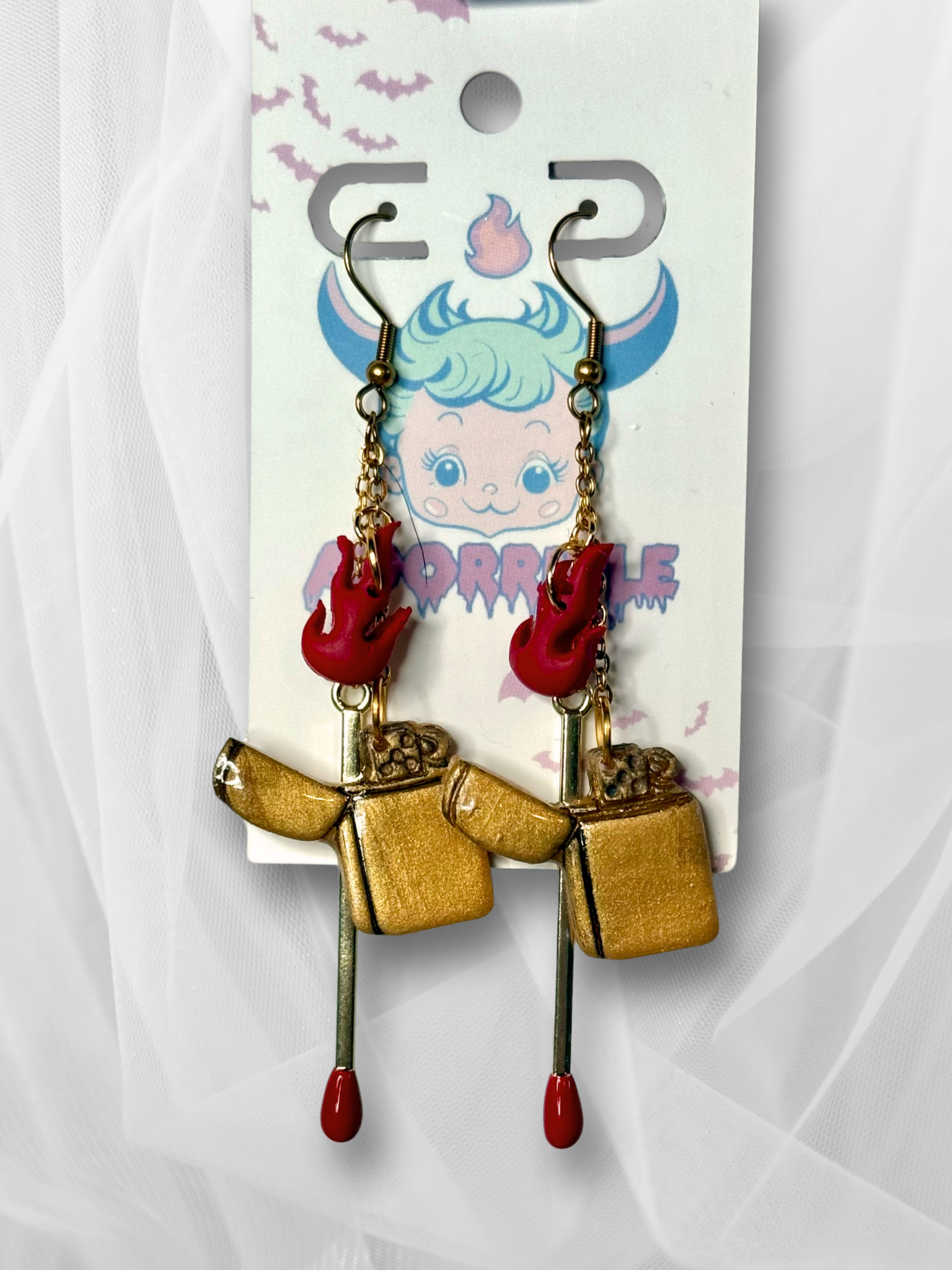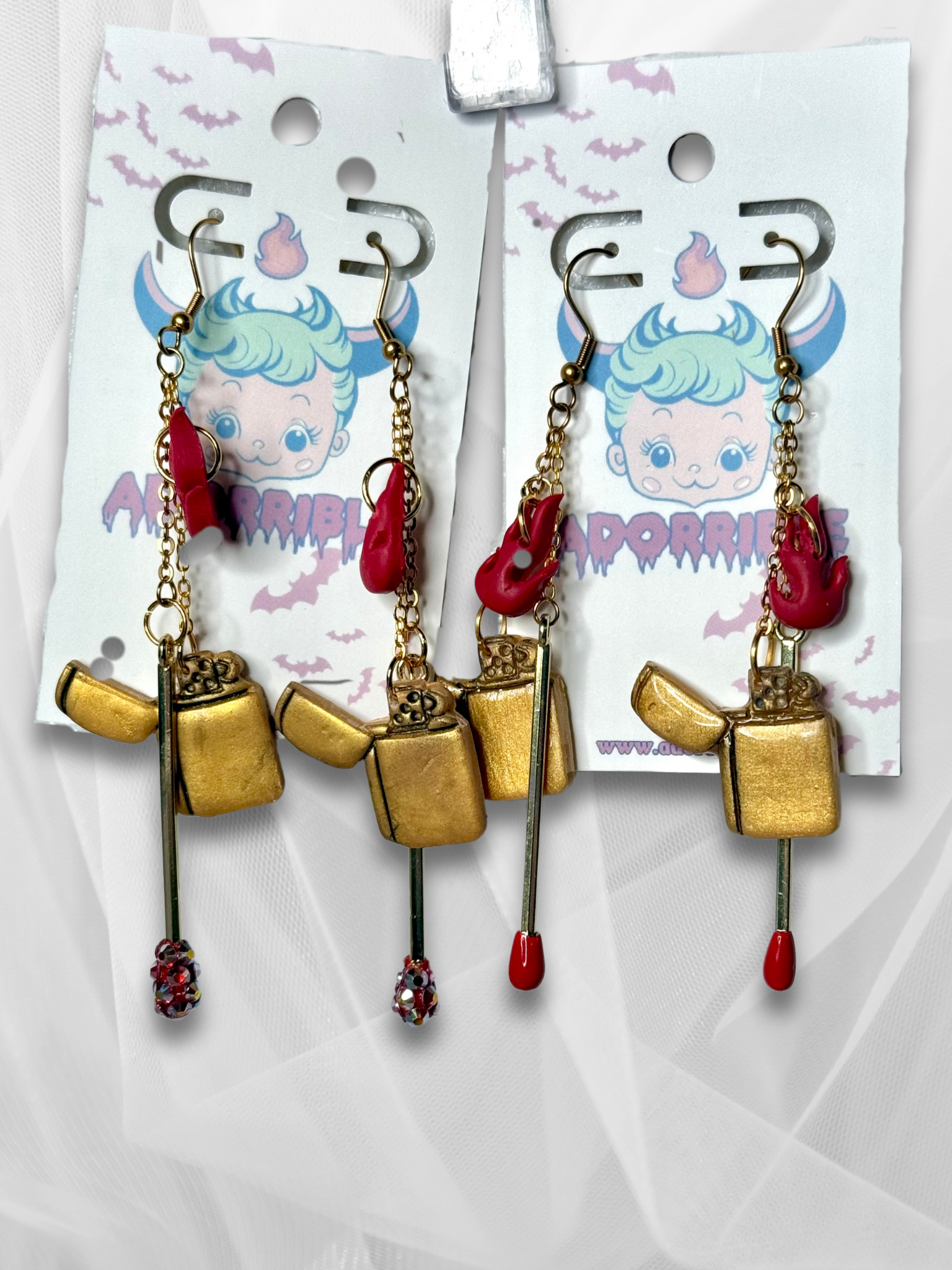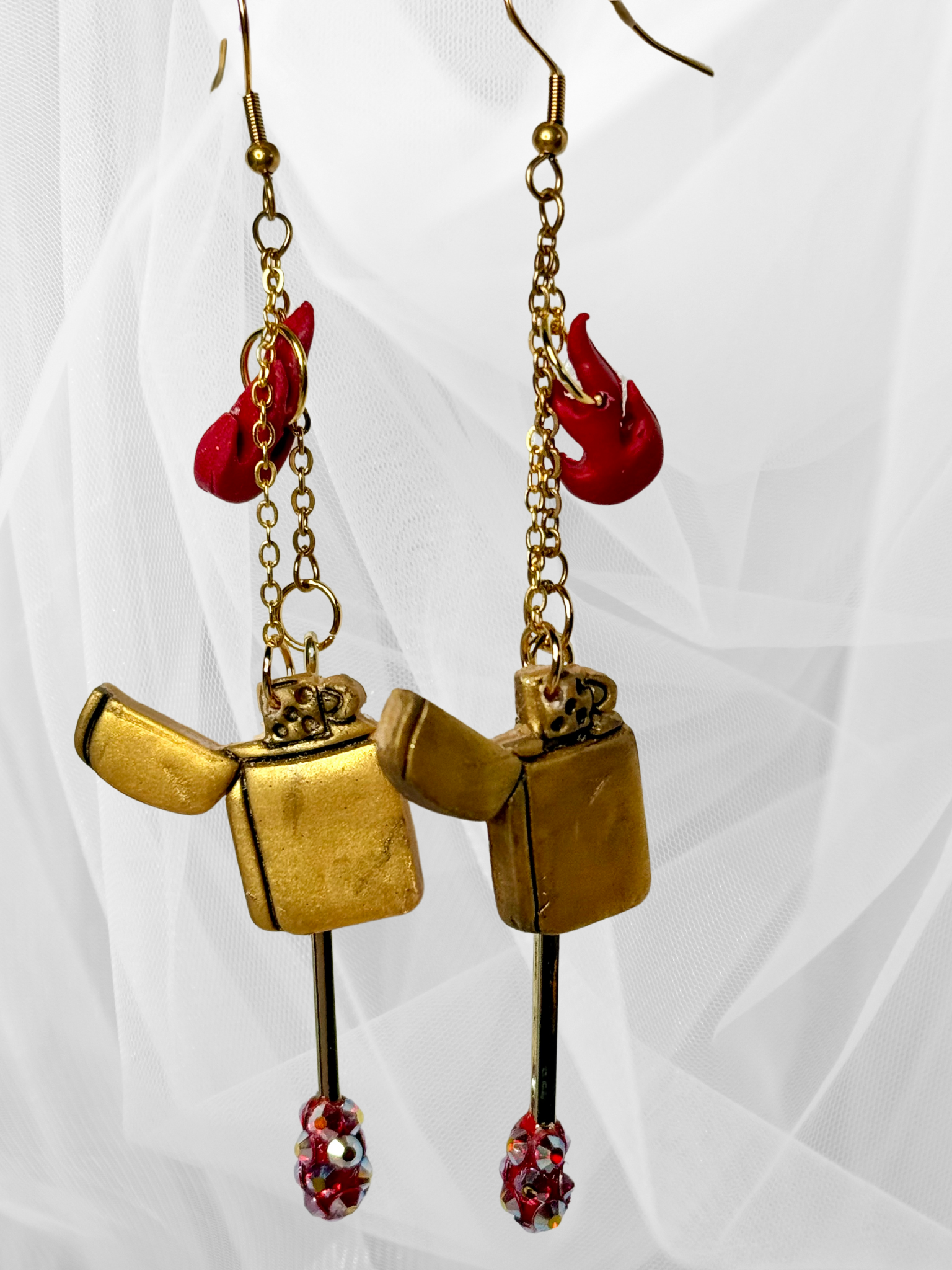 Spice up your look with our Light My Fire Earrings! These handmade and hand painted earrings feature adorable lighters paired with flames and blinged out matchsticks. The dangle design is unique and so fun to wear! If edgy and interesting is your style these are the earrings for you!