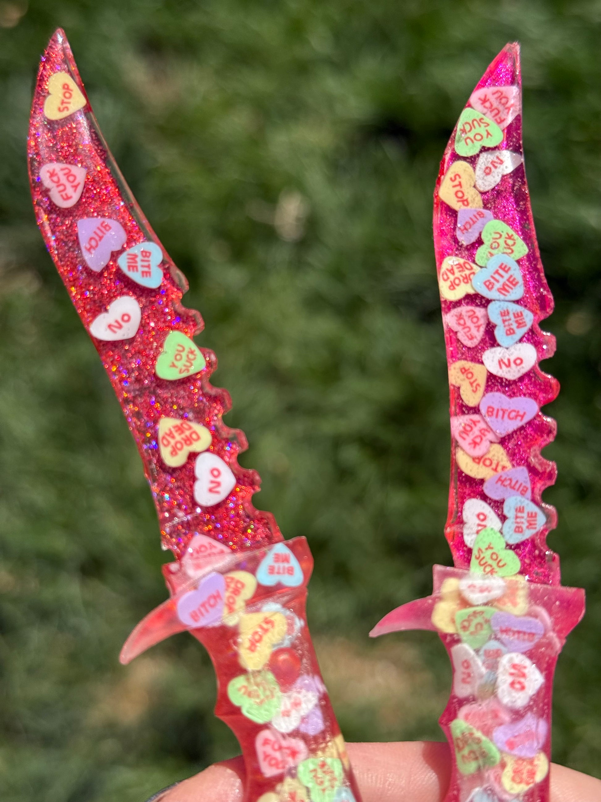 Stab Cupid's arrow with the Lil Hater Anti Valentines Heart Glitter Resin Dagger. This playful resin dagger features rude conversation hearts with phrases like “bite me” and “you suck” and more sassy sayings on a red holographic background, making it the perfect anti Valentine's Day gift.