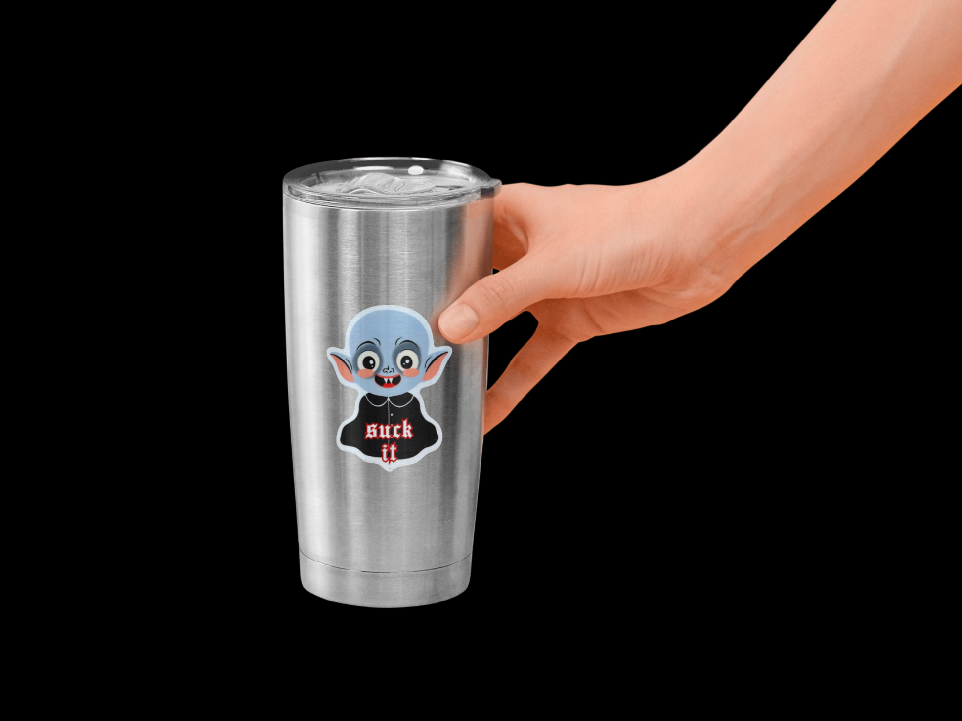 Add some vampiric flair to your belongings with the Nosferatu Suck It sticker! Featuring a cartoon image of the classic vampire with the playful phrase "suck it", this sticker is sure to bring a smile to your face. Perfect for laptops, water bottles, and more!