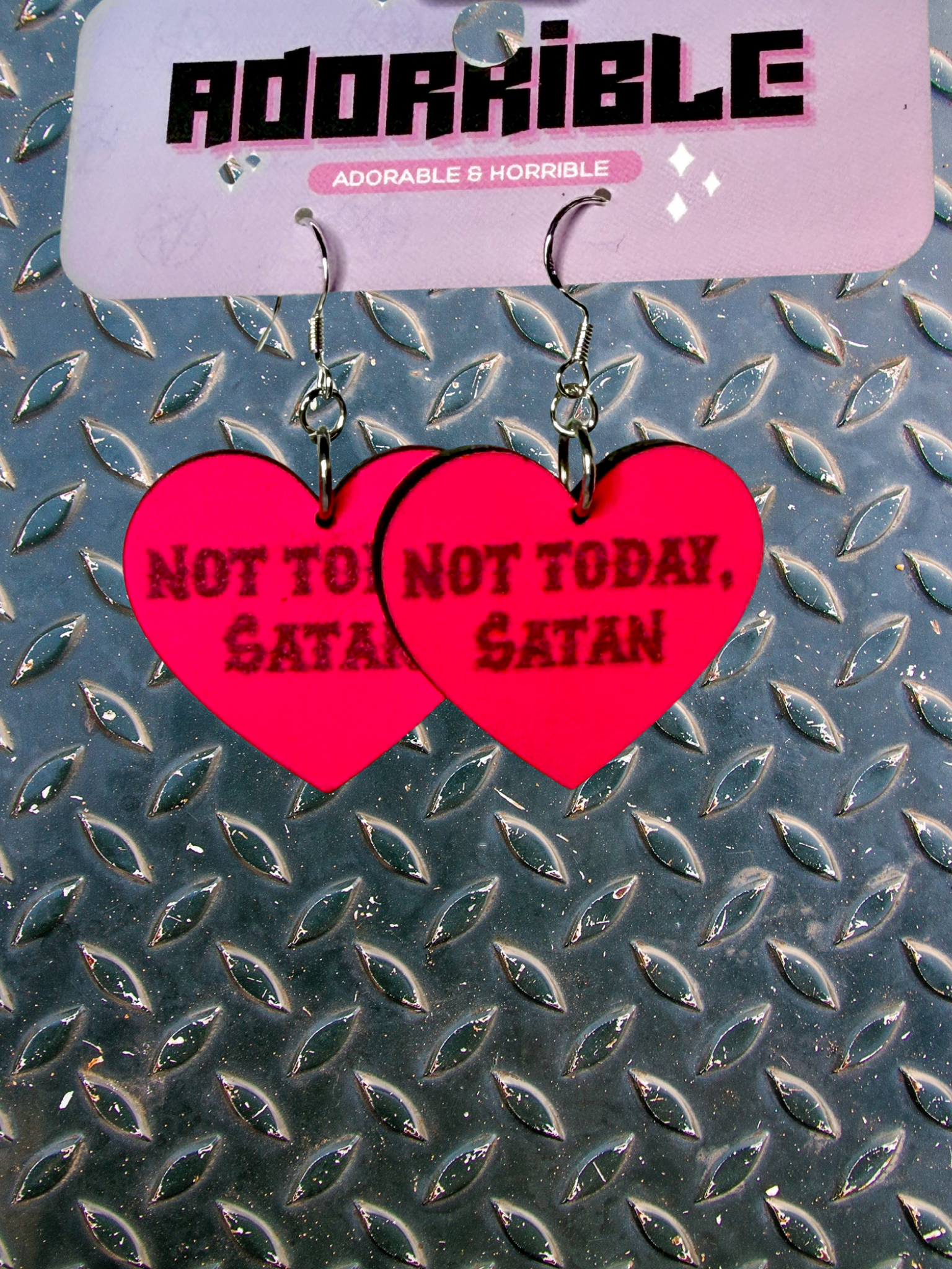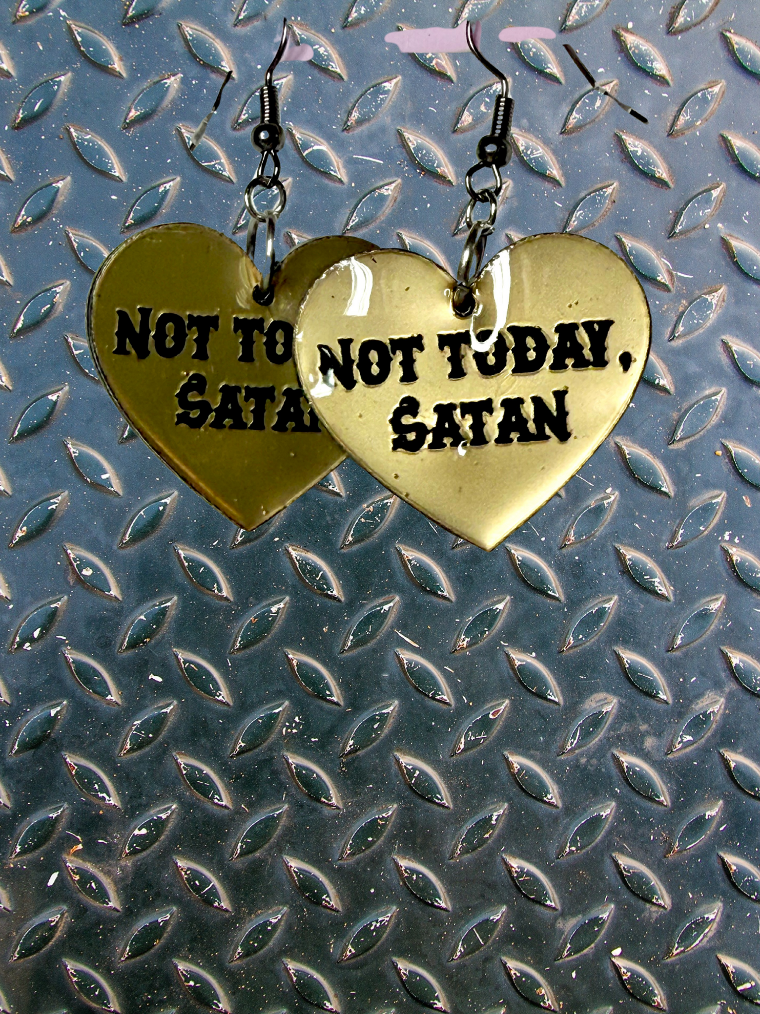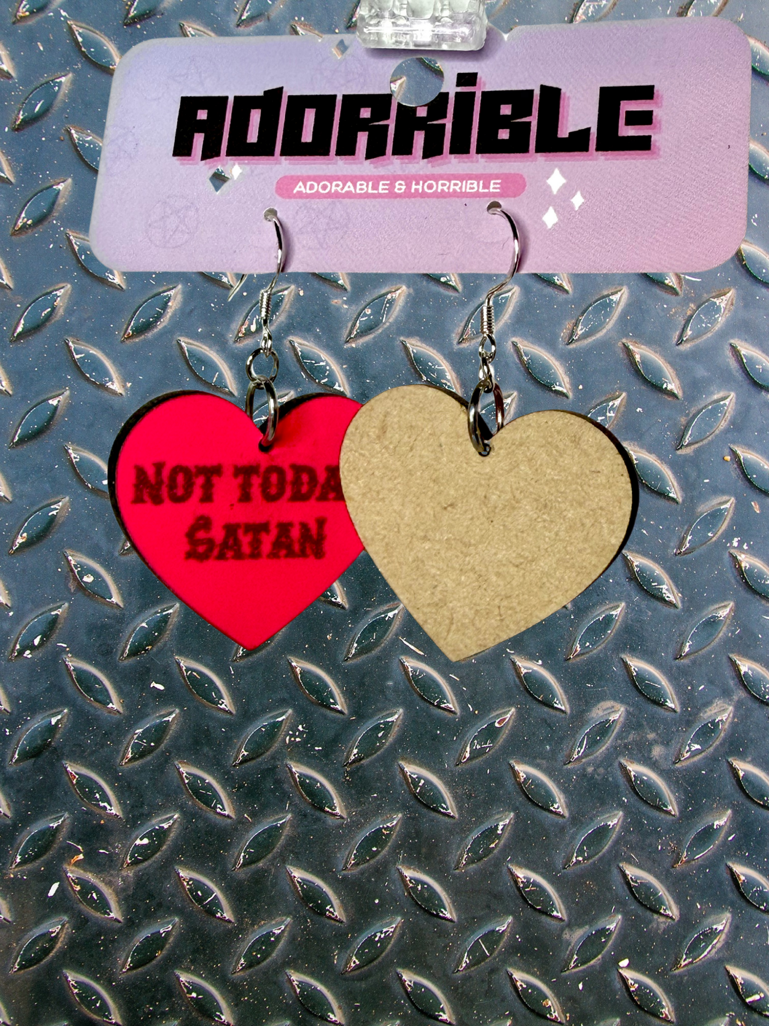 Add a playful touch to any outfit with these unique handmade heart earrings. Made of either acrylic or wood, each pair features the phrase "not today Satan" etched into the heart. Finished with silver French hooks, these earrings are perfect for anyone looking to add some sassy flair to their style.