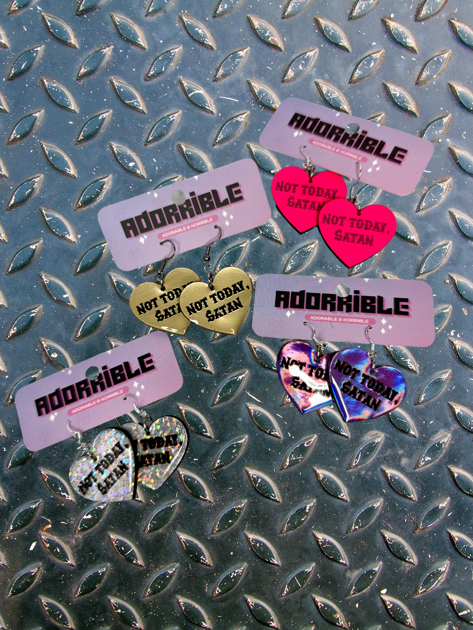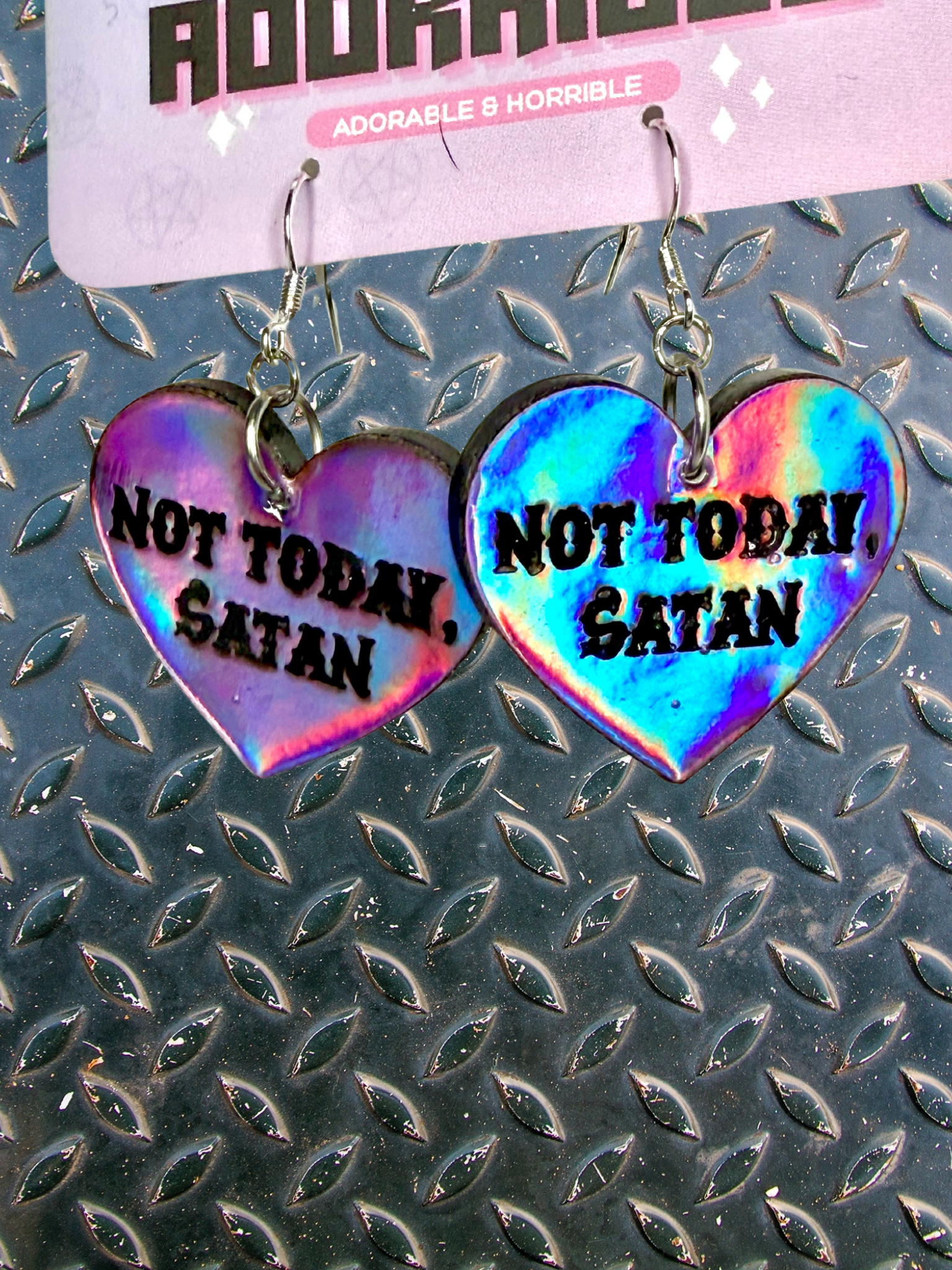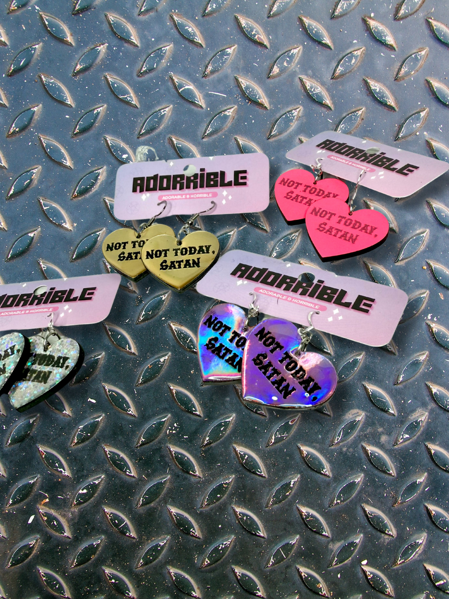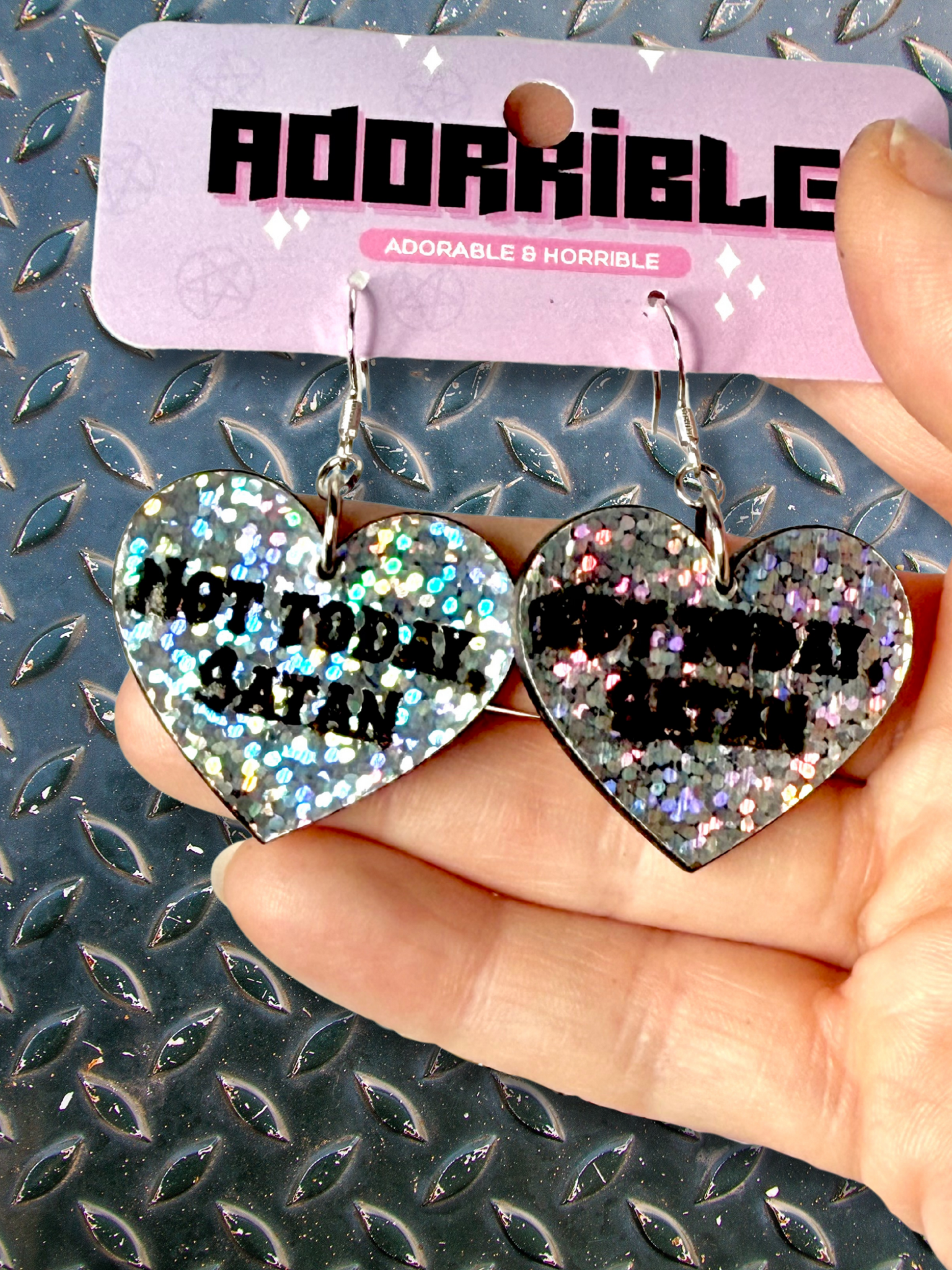 Add a playful touch to any outfit with these unique handmade heart earrings. Made of either acrylic or wood, each pair features the phrase "not today Satan" etched into the heart. Finished with silver French hooks, these earrings are perfect for anyone looking to add some sassy flair to their style.