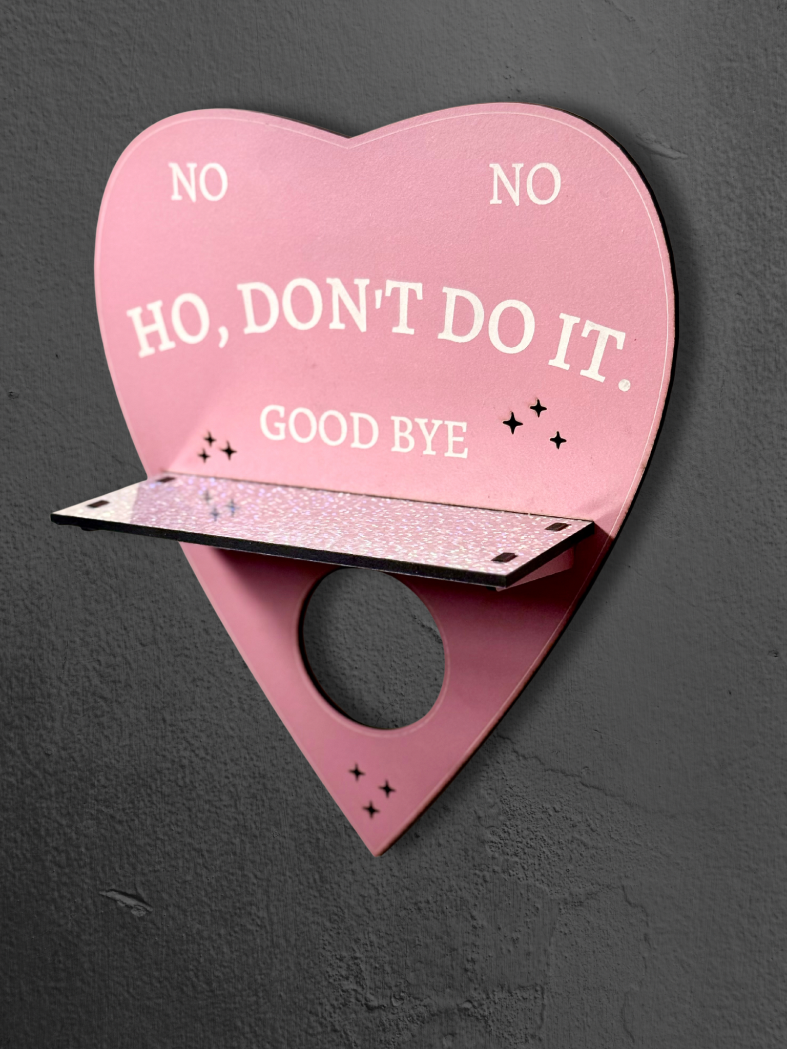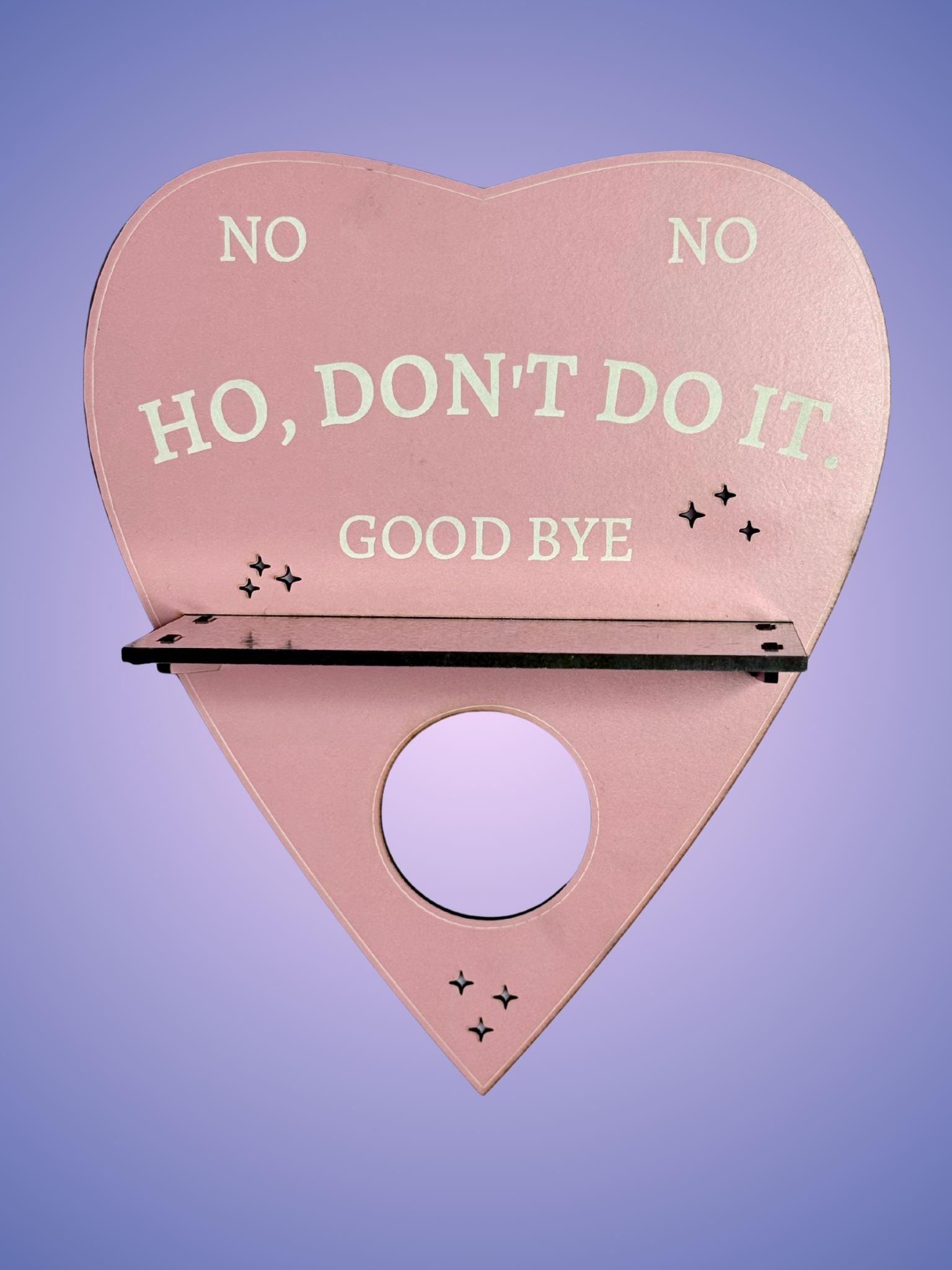 Add some sass to your home decor with our cute Pink Ouija Planchette Shelf! Made of lightweight MDF with a light pink painted veneer, this heart-shaped shelf features the quirky phrase "ho, don't do it". The small holographic shelf is perfect for displaying your favorite trinkets. (Just don't blame us if your knickknacks start moving on their own!)