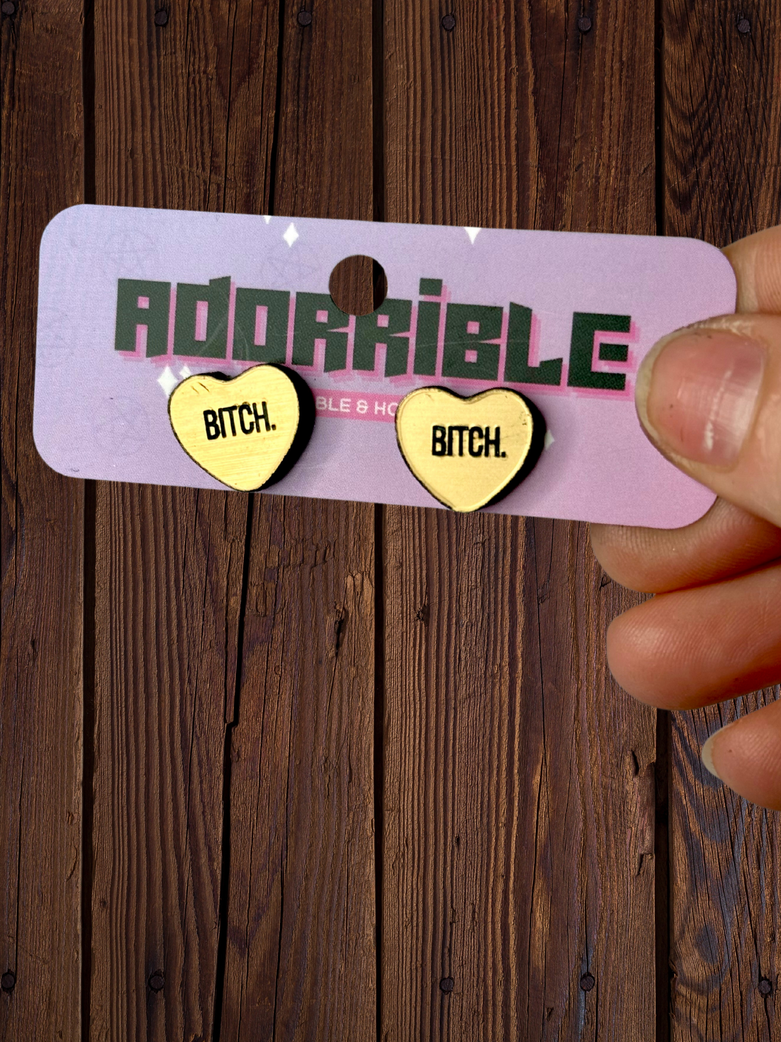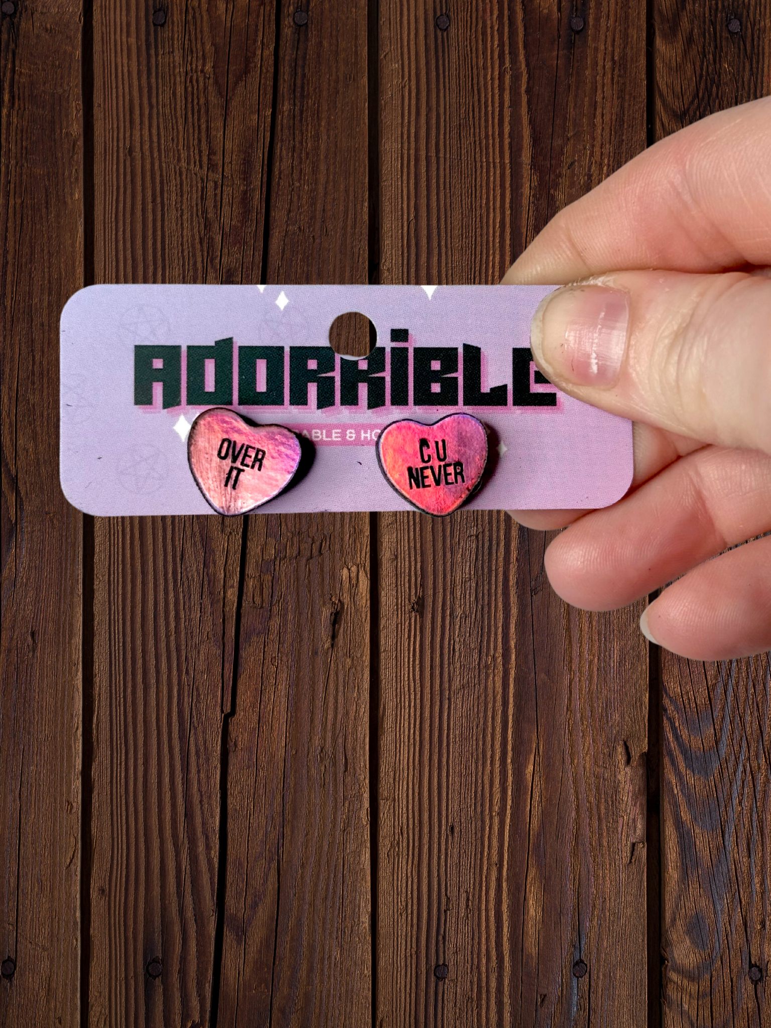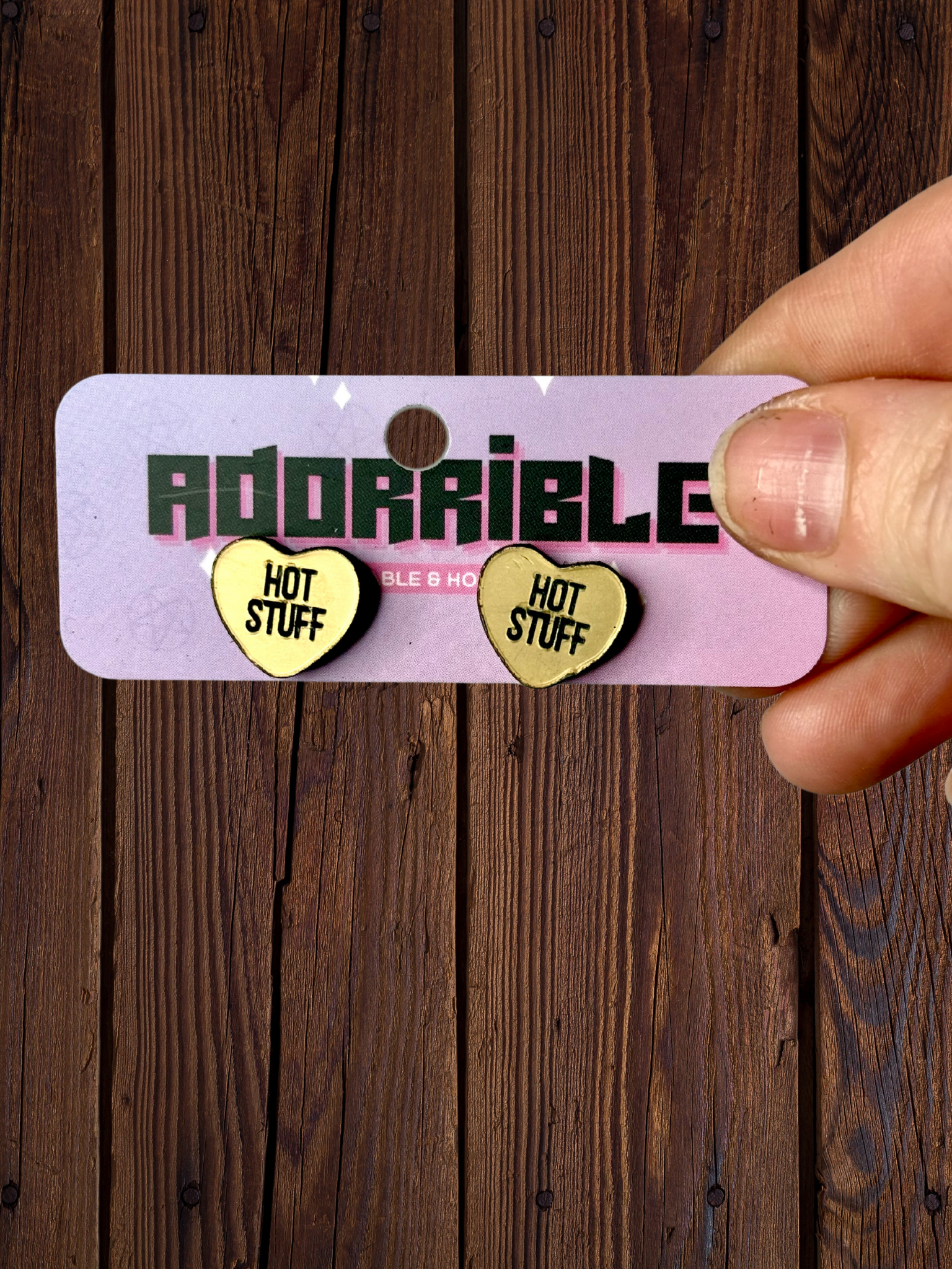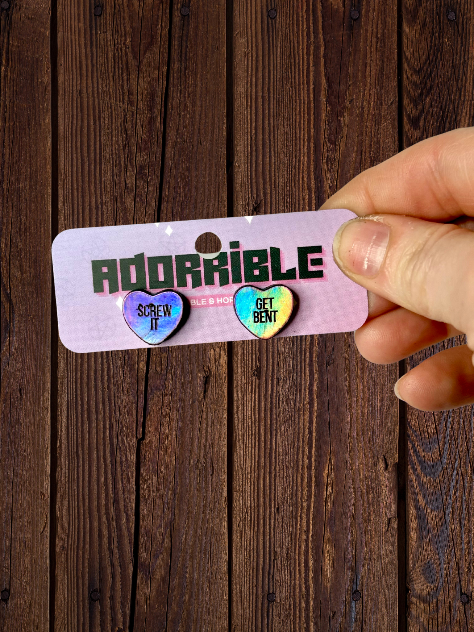 Add some sass to your wardrobe with our Sassy Heart Studs! These small, half inch hearts come in a variety of colors and phrases, allowing you to mix and match for a playful look. Perfect for the person who wants to add a bit of humor to their earrings (without being too obvious).