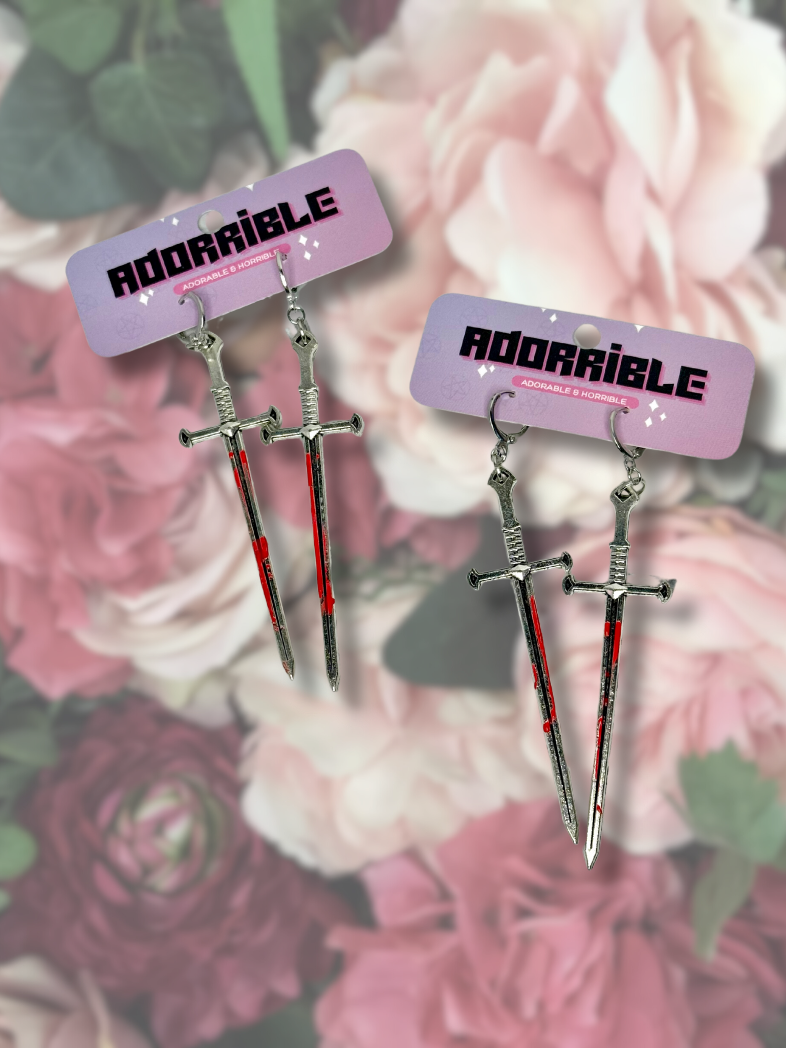 Add a fierce touch to your style with our Bloody Sword Earrings! These metal charm earrings feature realistic sword details with fake blood on the blades. The lever back closures make them perfect for stretched ears, and they make an amazing gift for medieval lovers. Get ready to conquer your fashion game!