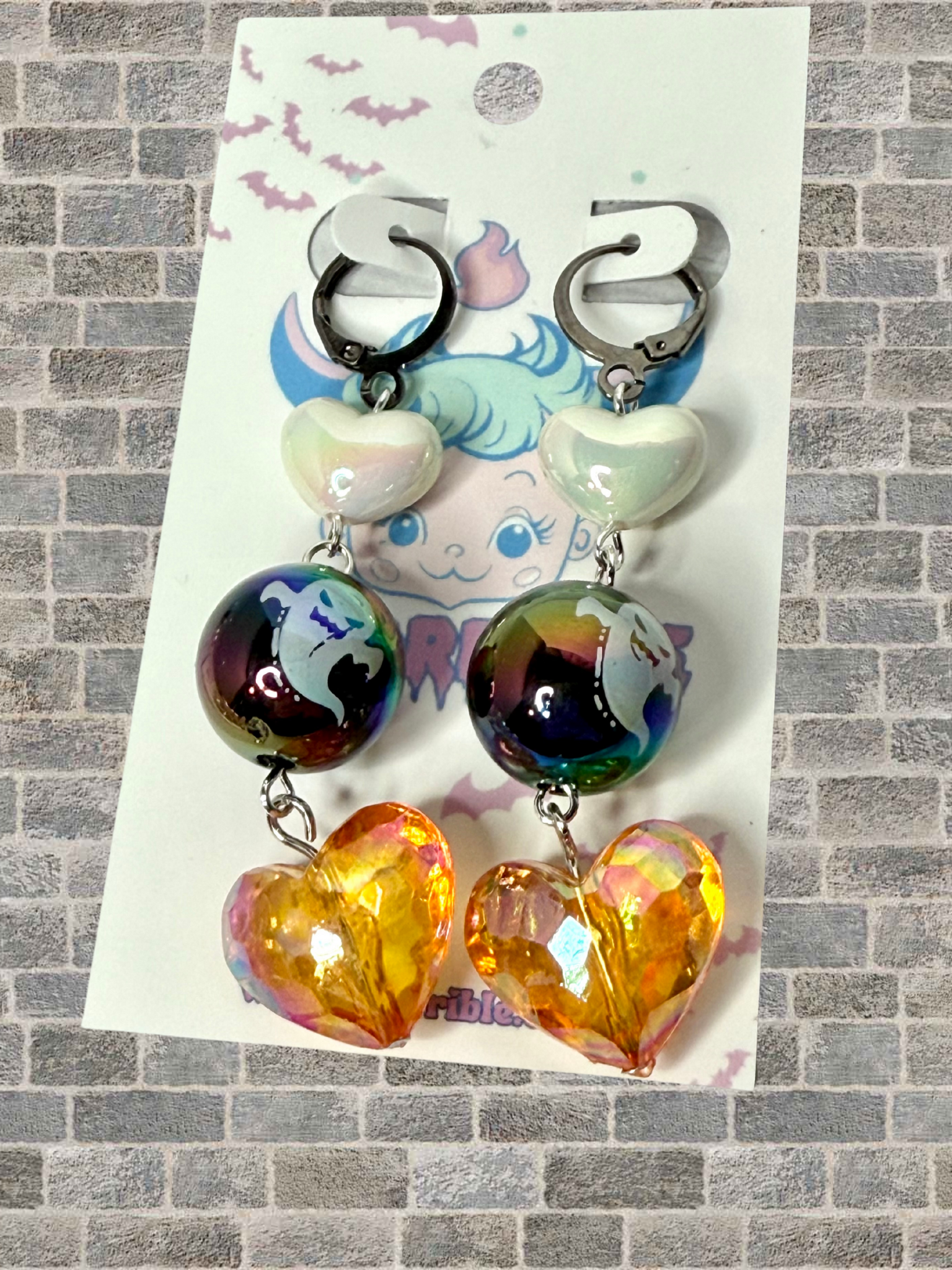 Get ready to add some spook and sparkle to your outfit with our Spooky Sparkly Dangle Earrings! Made with adorable Halloween themed iridescent round beads and fancy faceted heart beads or disco balls, this cute combo of spooky and sweet is sure to make a statement. The lightweight dangle design is both fun and easy to wear, and the lever back closures ensure secure wear. Happy haunting!